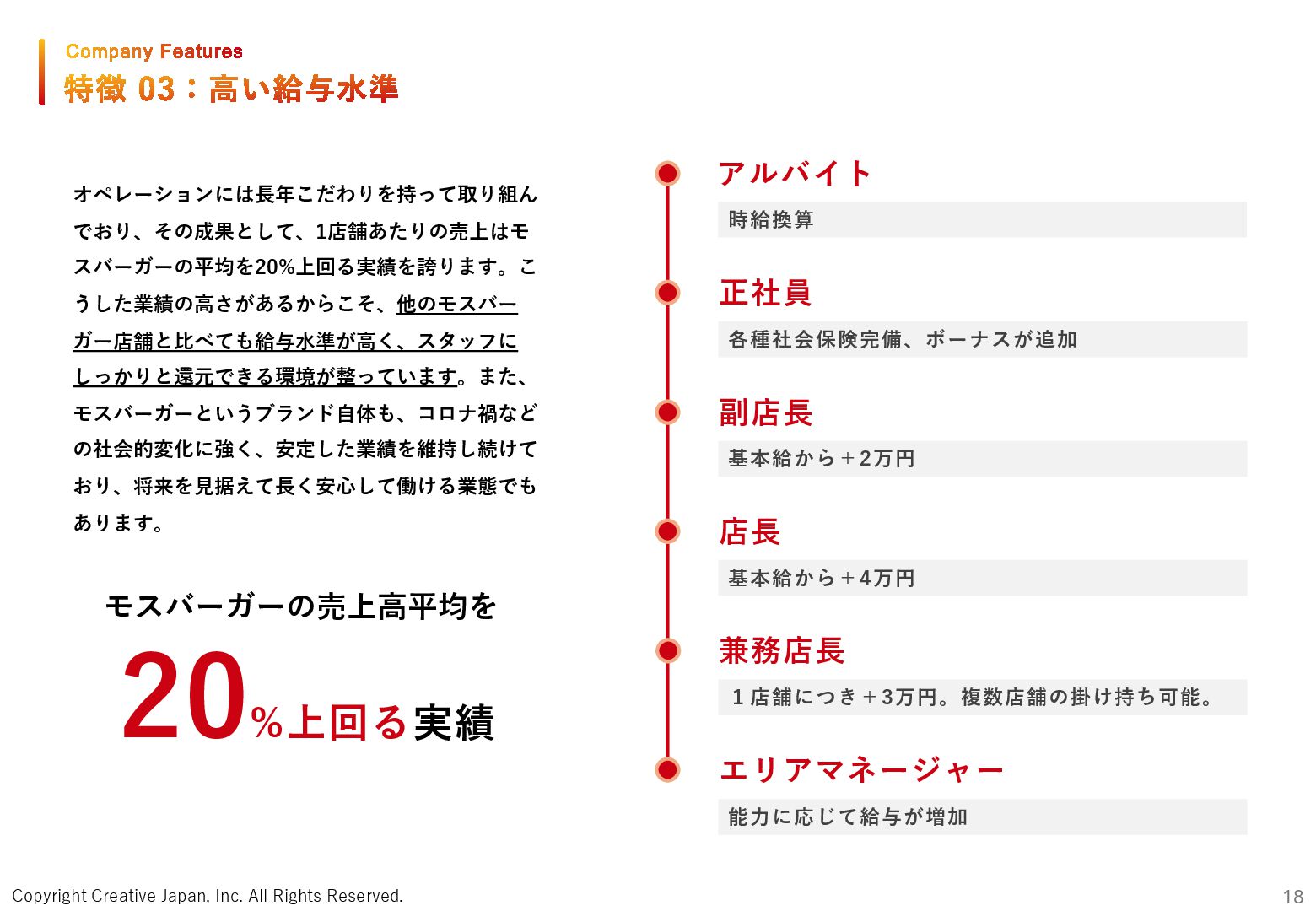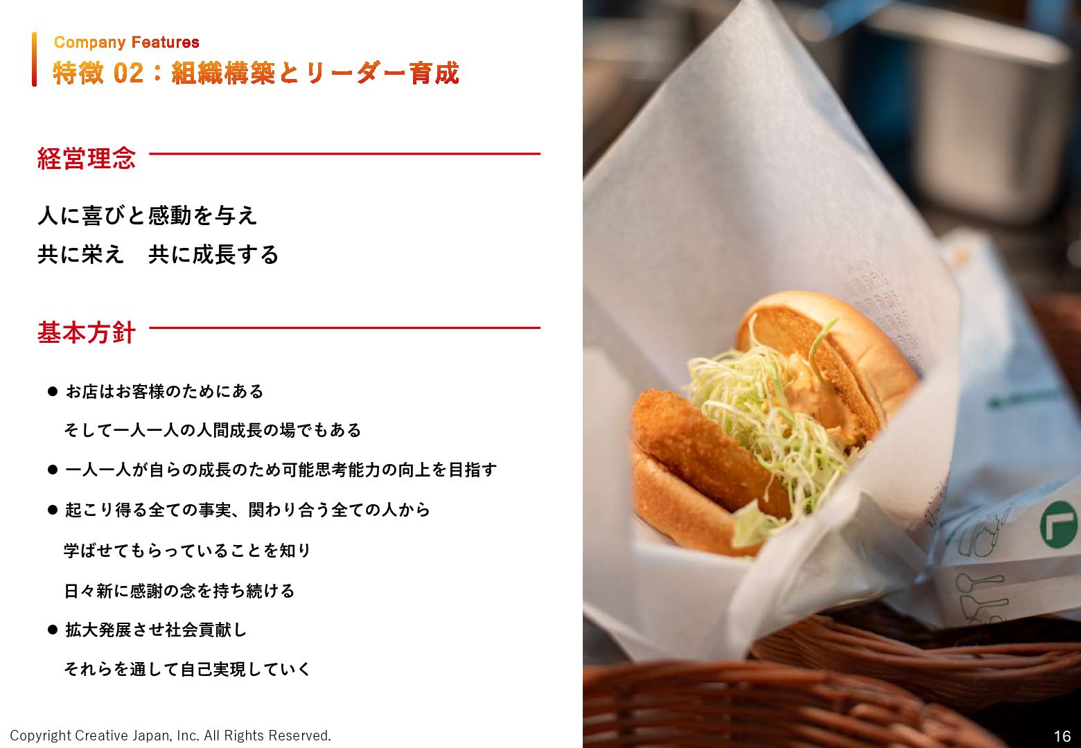 16. Copyright Creative Japan, Inc. All Rights Reserved. オペレーションには⻑年こだわりを持って取り組ん でおり、その成果として、1店舗あたりの売上はモ スバーガーの平均を20%上回る実績を誇ります。こ