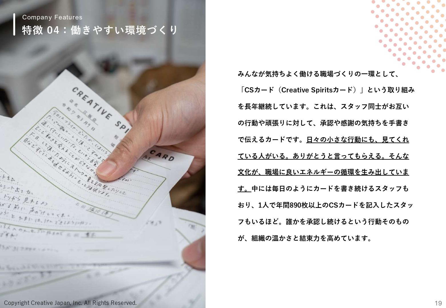 を⻑年継続しています。これは、スタッフ同⼠がお互い の⾏動や頑張りに対して、承認や感謝の気持ちを⼿書き で伝えるカードです。⽇々の⼩さな⾏動にも、⾒てくれ ている⼈がいる。ありがとうと⾔ってもらえる。そんな ⽂化が、職場に良いエネルギーの循環を⽣み出していま す。中には毎⽇のようにカードを書き続けるスタッフも おり、1⼈で年間890枚以上のCSカードを記⼊したスタッ フもいるほど。誰かを承認し続けるという⾏動そのもの が、組織の温かさと結束⼒を⾼めています。 特徴 04:働きやすい環境づくり Company Features 19