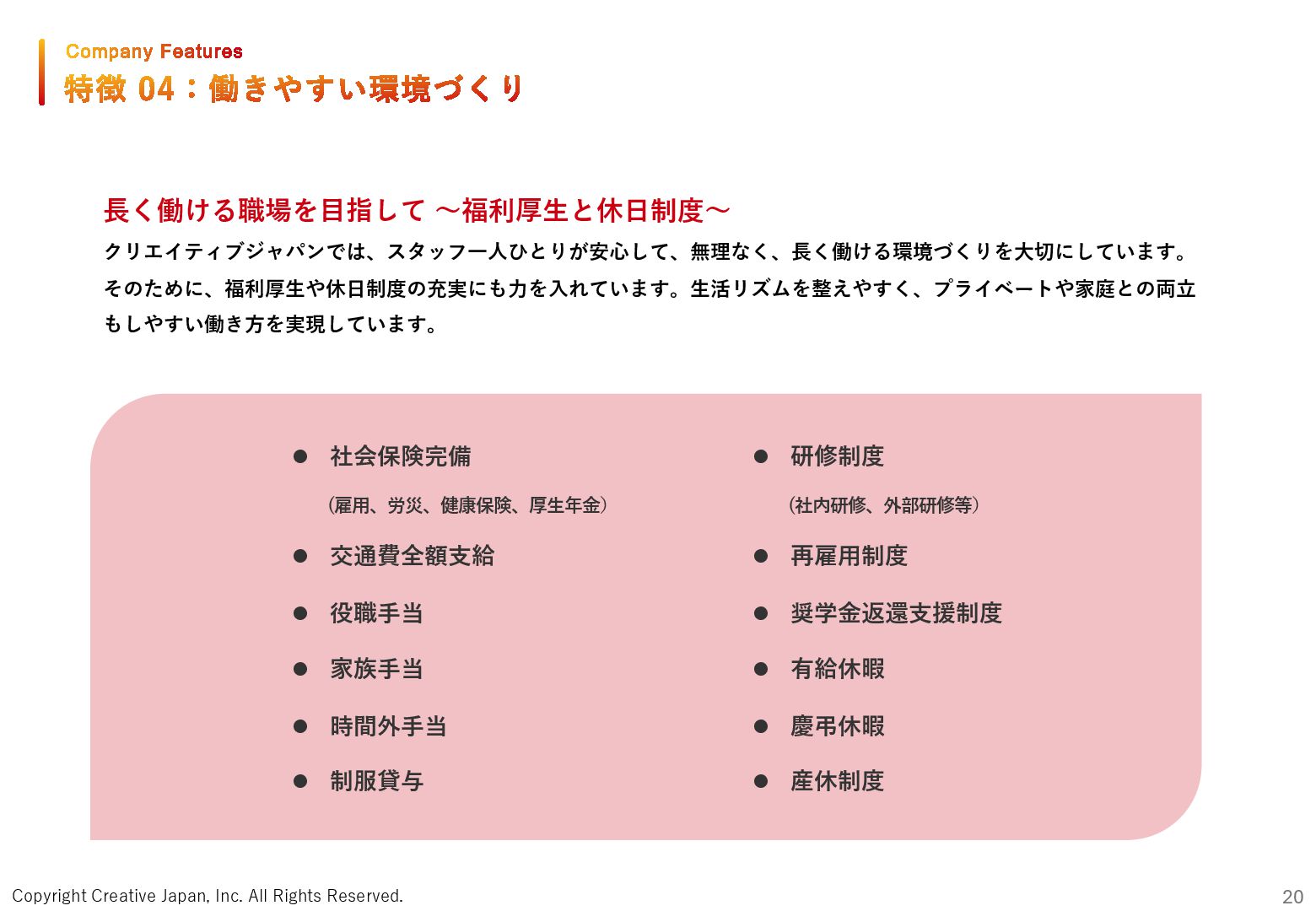 18. Copyright Creative Japan, Inc. All Rights Reserved. ⻑く働ける職場を⽬指して 〜福利厚⽣と休⽇制度〜 クリエイティブジャパンでは、スタッフ⼀⼈ひとりが安⼼して、無理なく、⻑く働ける環境づくりを⼤切にしています。