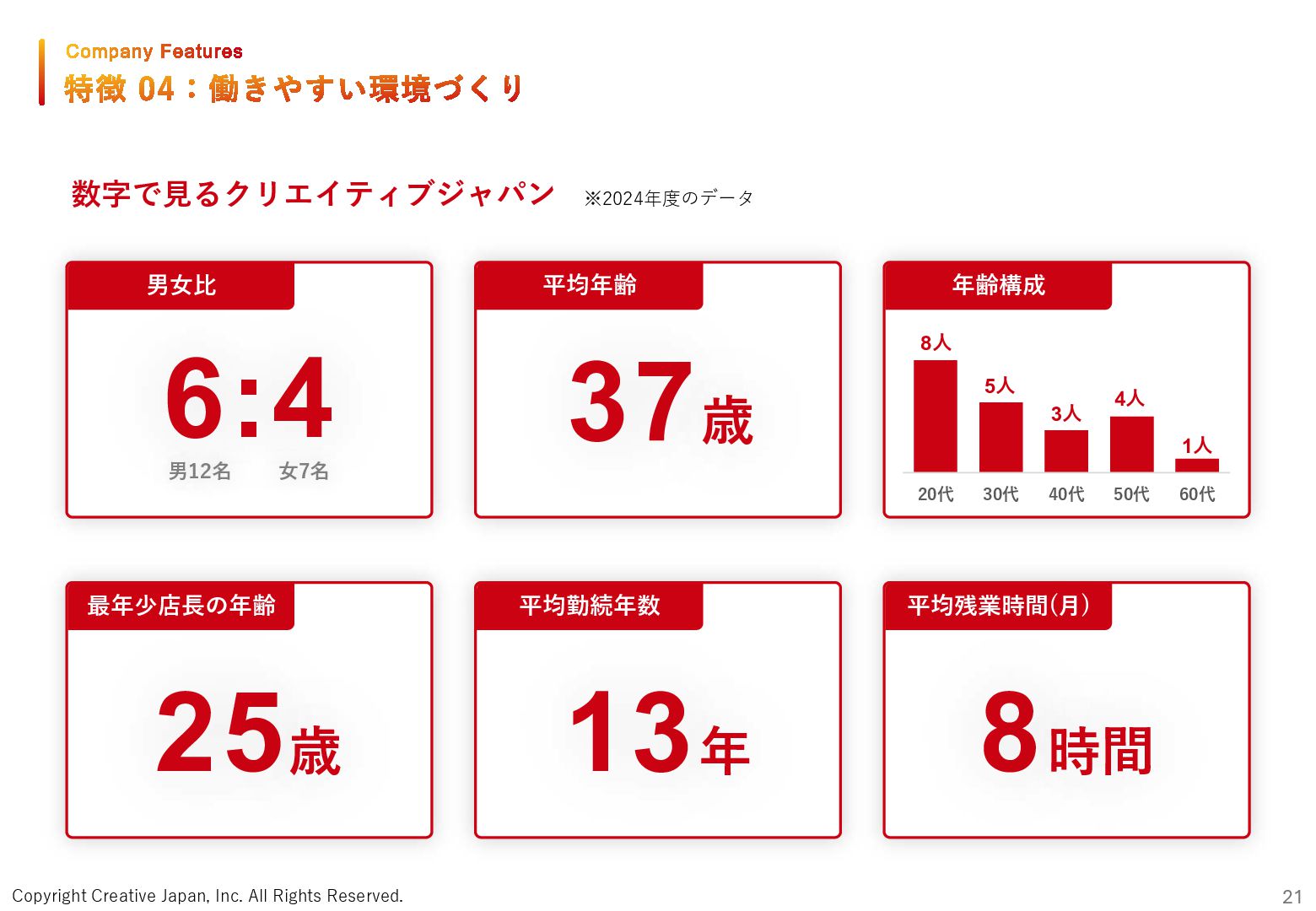 男⼥⽐ 37歳 平均年齢 年齢構成 8⼈ 5⼈ 3⼈ 4⼈ 1⼈ 20代 30代 40代 50代 60代 25歳 最年少店⻑の年齢 13年 平均勤続年数 8時間 平均残業時間(⽉) 数字で⾒るクリエイティブジャパン ※2024年度のデータ 21