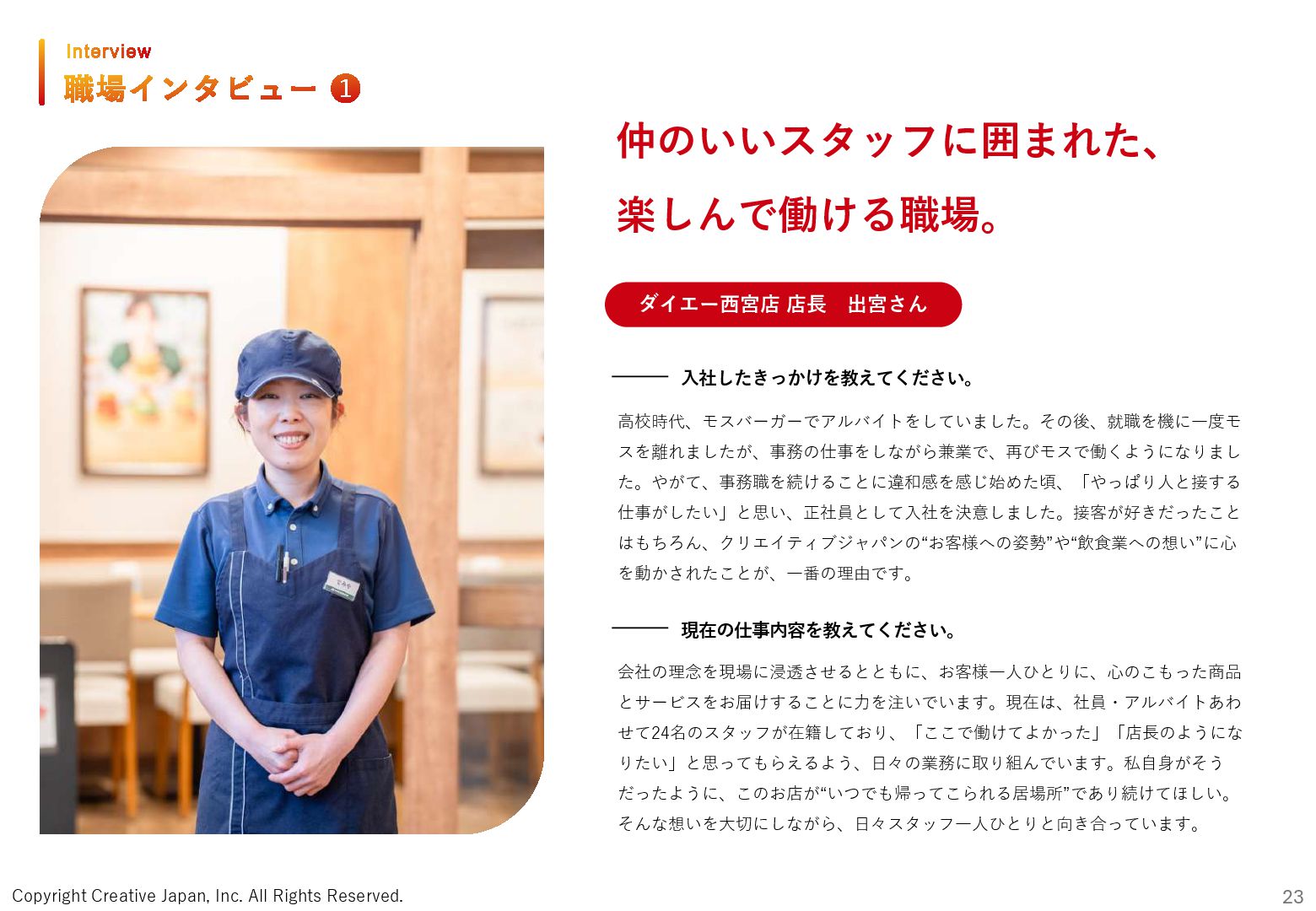 せて24名のスタッフが在籍しており、「ここで働けてよかった」「店⻑のようにな りたい」と思ってもらえるよう、⽇々の業務に取り組んでいます。私⾃⾝がそう だったように、このお店が“いつでも帰ってこられる居場所”であり続けてほしい。 そんな想いを⼤切にしながら、⽇々スタッフ⼀⼈ひとりと向き合っています。 ダイエー⻄宮店 店⻑ 出宮さん ⼊社したきっかけを教えてください。 ⾼校時代、モスバーガーでアルバイトをしていました。その後、就職を機に⼀度モ スを離れましたが、事務の仕事をしながら兼業で、再びモスで働くようになりまし た。やがて、事務職を続けることに違和感を感じ始めた頃、「やっぱり⼈と接する 仕事がしたい」と思い、正社員として⼊社を決意しました。接客が好きだったこと はもちろん、クリエイティブジャパンの“お客様への姿勢”や“飲⾷業への想い”に⼼ を動かされたことが、⼀番の理由です。 仲のいいスタッフに囲まれた、 楽しんで働ける職場。 23