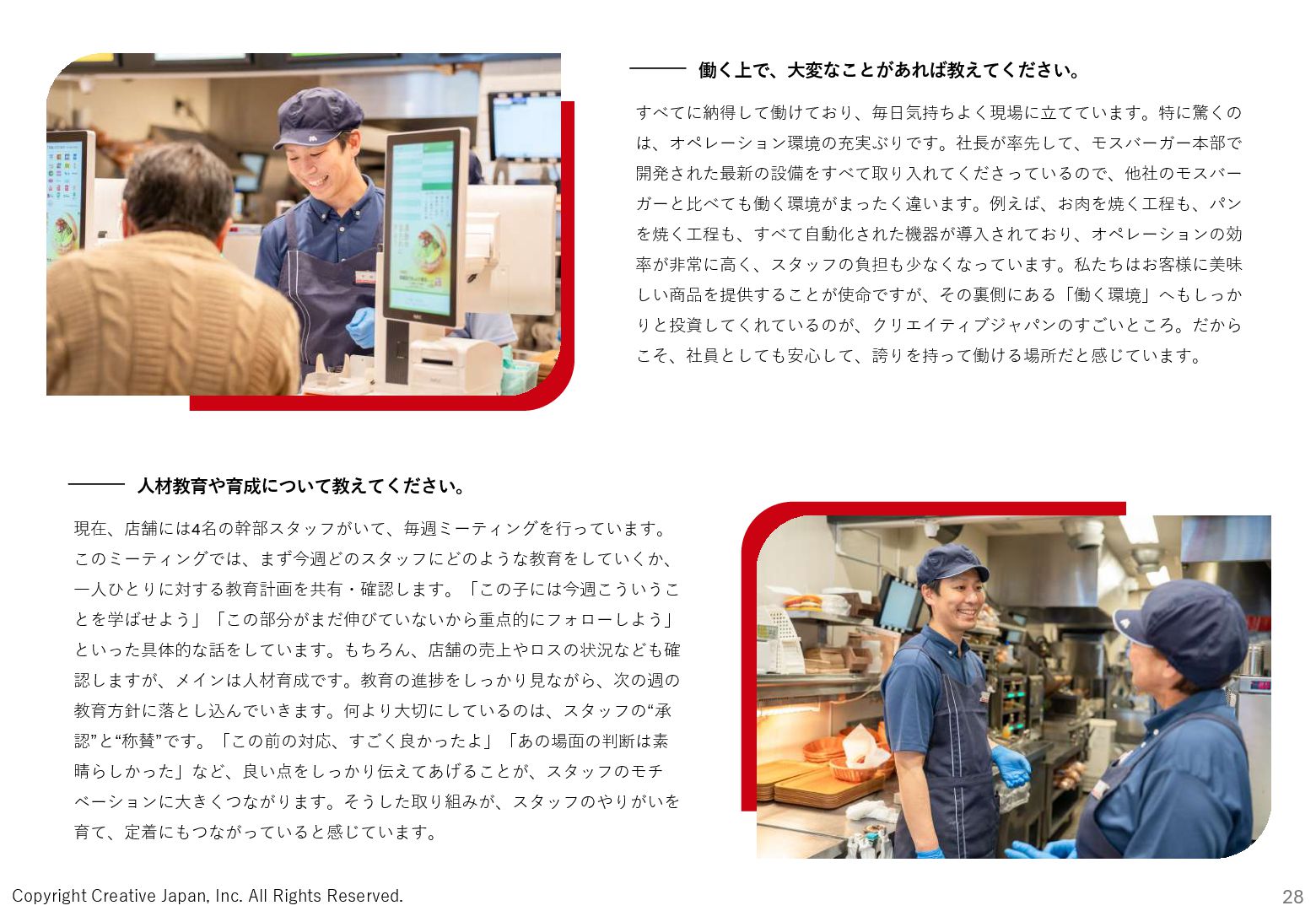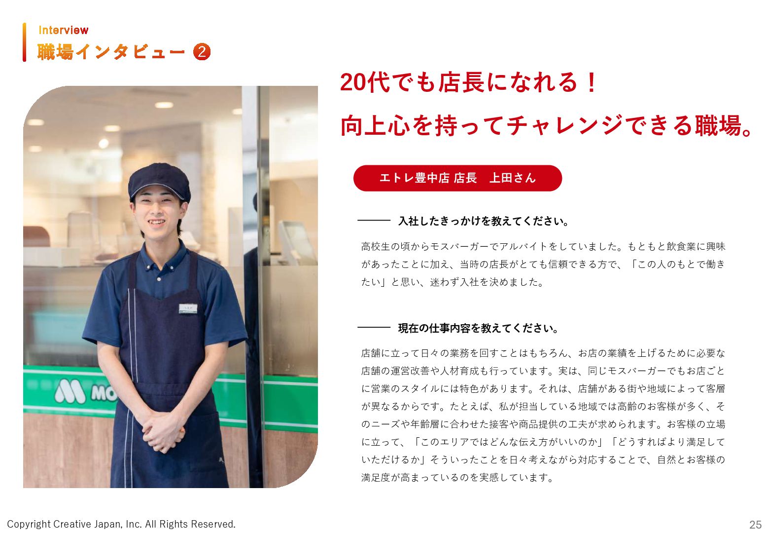 23. Copyright Creative Japan, Inc. All Rights Reserved. 現在の仕事内容を教えてください。 店舗に⽴って⽇々の業務を回すことはもちろん、お店の業績を上げるために必要な 店舗の運営改善や⼈材育成も⾏っています。実は、同じモスバーガーでもお店ごと