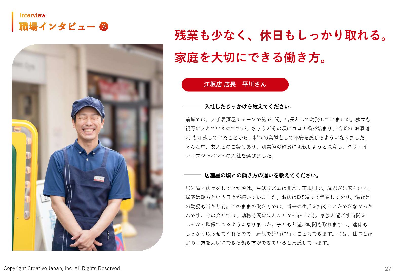 の勤務も当たり前。このままの働き⽅では、将来の⽣活を描くことができなかった んです。今の会社では、勤務時間はほとんどが8時〜17時。家族と過ごす時間を しっかり確保できるようになりました。⼦どもと遊ぶ時間も取れますし、連休も しっかり取らせてくれるので、家族で旅⾏に⾏くこともできます。今は、仕事と家 庭の両⽅を⼤切にできる働き⽅ができていると実感しています。 江坂店 店⻑ 平川さん ⼊社したきっかけを教えてください。 前職では、⼤⼿居酒屋チェーンで約5年間、店⻑として勤務していました。独⽴も 視野に⼊れていたのですが、ちょうどその頃にコロナ禍が始まり、若者の“お酒離 れ”も加速していたことから、将来の業態として不安を感じるようになりました。 そんな中、友⼈とのご縁もあり、別業態の飲⾷に挑戦しようと決意し、クリエイ ティブジャパンへの⼊社を選びました。 残業も少なく、休⽇もしっかり取れる。 家庭を⼤切にできる働き⽅。 27