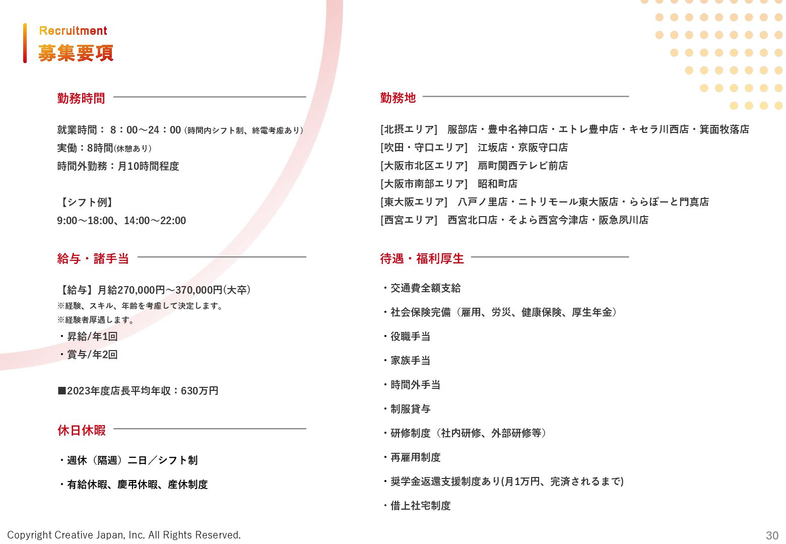 実働:8時間(休憩あり) 時間外勤務:⽉10時間程度 【シフト例】 9:00〜18:00、14:00〜22:00 ・交通費全額⽀給 ・社会保険完備(雇⽤、労災、健康保険、厚⽣年⾦) ・役職⼿当 ・家族⼿当 ・時間外⼿当 ・制服貸与 ・研修制度(社内研修、外部研修等) ・再雇⽤制度 ・奨学⾦返還⽀援制度あり(⽉1万円、完済されるまで) ・借上社宅制度 ・週休(隔週)⼆⽇/シフト制 ・有給休暇、慶弔休暇、産休制度 勤務時間 休⽇休暇 待遇・福利厚⽣ 給与・諸⼿当 【給与】⽉給270,000円〜370,000円(⼤卒) ※経験、スキル、年齢を考慮して決定します。 ※経験者厚遇します。 ・昇給/年1回 ・賞与/年2回 ▪2023年度店⻑平均年収:630万円 [北摂エリア] 服部店・豊中名神⼝店・エトレ豊中店・キセラ川⻄店・箕⾯牧落店 [吹⽥・守⼝エリア] 江坂店・京阪守⼝店 [⼤阪市北区エリア] 扇町関⻄テレビ前店 [⼤阪市南部エリア] 昭和町店 [東⼤阪エリア] ⼋⼾ノ⾥店・ニトリモール東⼤阪店・ららぽーと⾨真店 [⻄宮エリア] ⻄宮北⼝店・そよら⻄宮今津店・阪急夙川店 勤務地 30