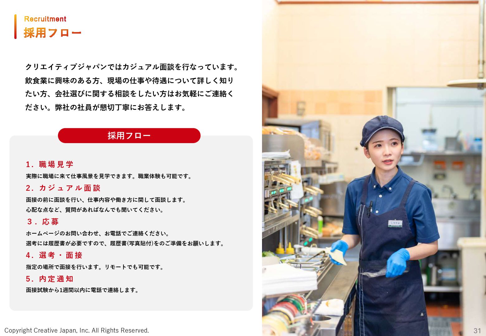 場 ⾒ 学 実際に職場に来て仕事⾵景を⾒学できます。職業体験も可能です。 2 . カ ジ ュ ア ル ⾯ 談 ⾯接の前に⾯談を⾏い、仕事内容や働き⽅に関して⾯談します。 ⼼配な点など、質問があればなんでも聞いてください。 3 . 応 募 ホームページのお問い合わせ、お電話でご連絡ください。 選考には履歴書が必要ですので、履歴書(写真貼付)をのご準備をお願いします。 4 . 選 考 ・ ⾯ 接 指定の場所で⾯接を⾏います。リモートでも可能です。 5 . 内 定 通 知 ⾯接試験から1週間以内に電話で連絡します。 クリエイティブジャパンではカジュアル⾯談を⾏なっています。 飲⾷業に興味のある⽅、現場の仕事や待遇について詳しく知り たい⽅、会社選びに関する相談をしたい⽅はお気軽にご連絡く ださい。弊社の社員が懇切丁寧にお答えします。 採⽤フロー 31