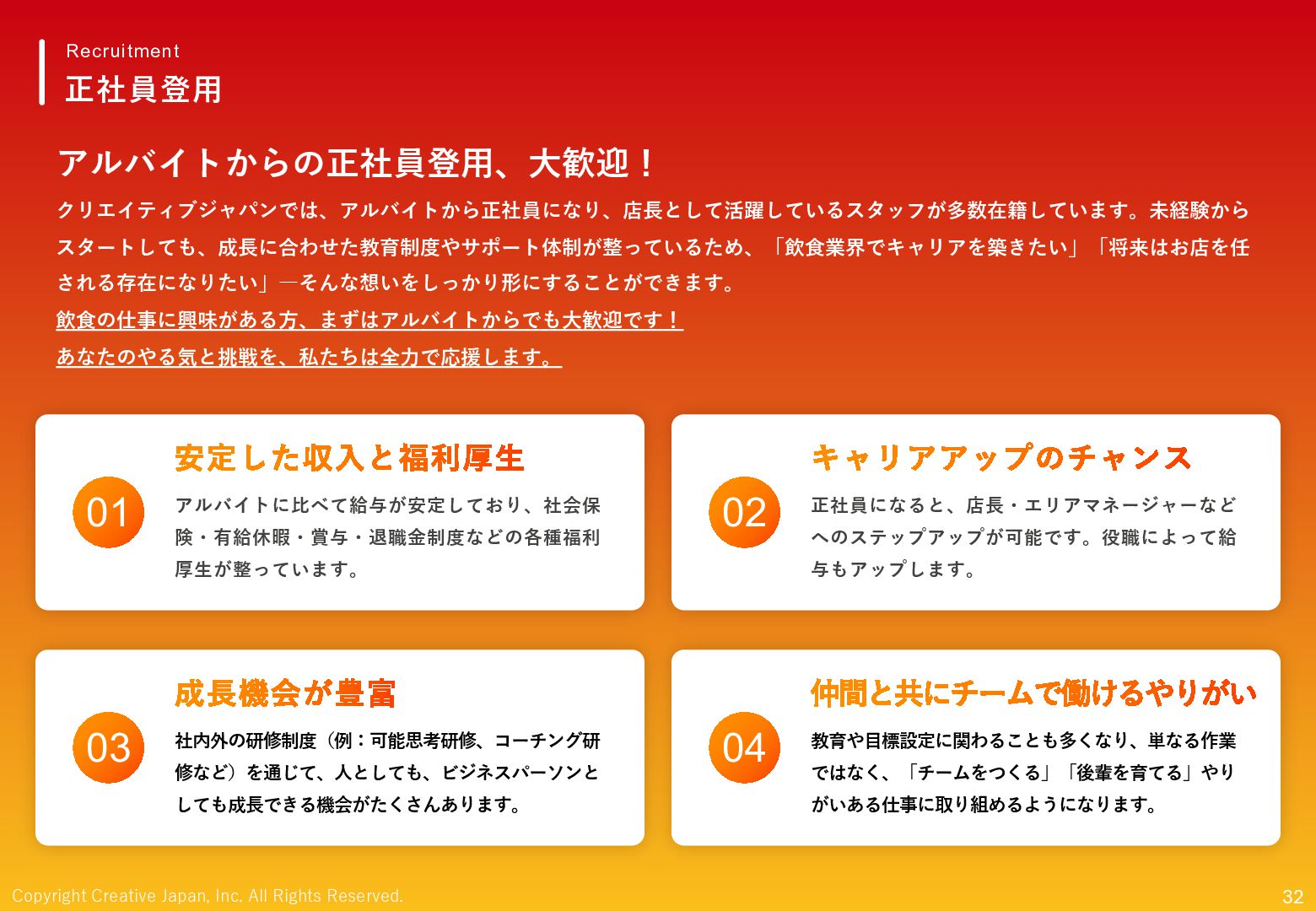 厚⽣が整っています。 02 正社員になると、店⻑・エリアマネージャーなど へのステップアップが可能です。役職によって給 与もアップします。 03 社内外の研修制度(例:可能思考研修、コーチング研 修など)を通じて、⼈としても、ビジネスパーソンと しても成⻑できる機会がたくさんあります。 04 教育や⽬標設定に関わることも多くなり、単なる作業 ではなく、「チームをつくる」「後輩を育てる」やり がいある仕事に取り組めるようになります。 アルバイトからの正社員登⽤、⼤歓迎! クリエイティブジャパンでは、アルバイトから正社員になり、店⻑として活躍しているスタッフが多数在籍しています。未経験から スタートしても、成⻑に合わせた教育制度やサポート体制が整っているため、「飲⾷業界でキャリアを築きたい」「将来はお店を任 される存在になりたい」―そんな想いをしっかり形にすることができます。 飲⾷の仕事に興味がある⽅、まずはアルバイトからでも⼤歓迎です! あなたのやる気と挑戦を、私たちは全⼒で応援します。 正社員登⽤ Recruitment 32