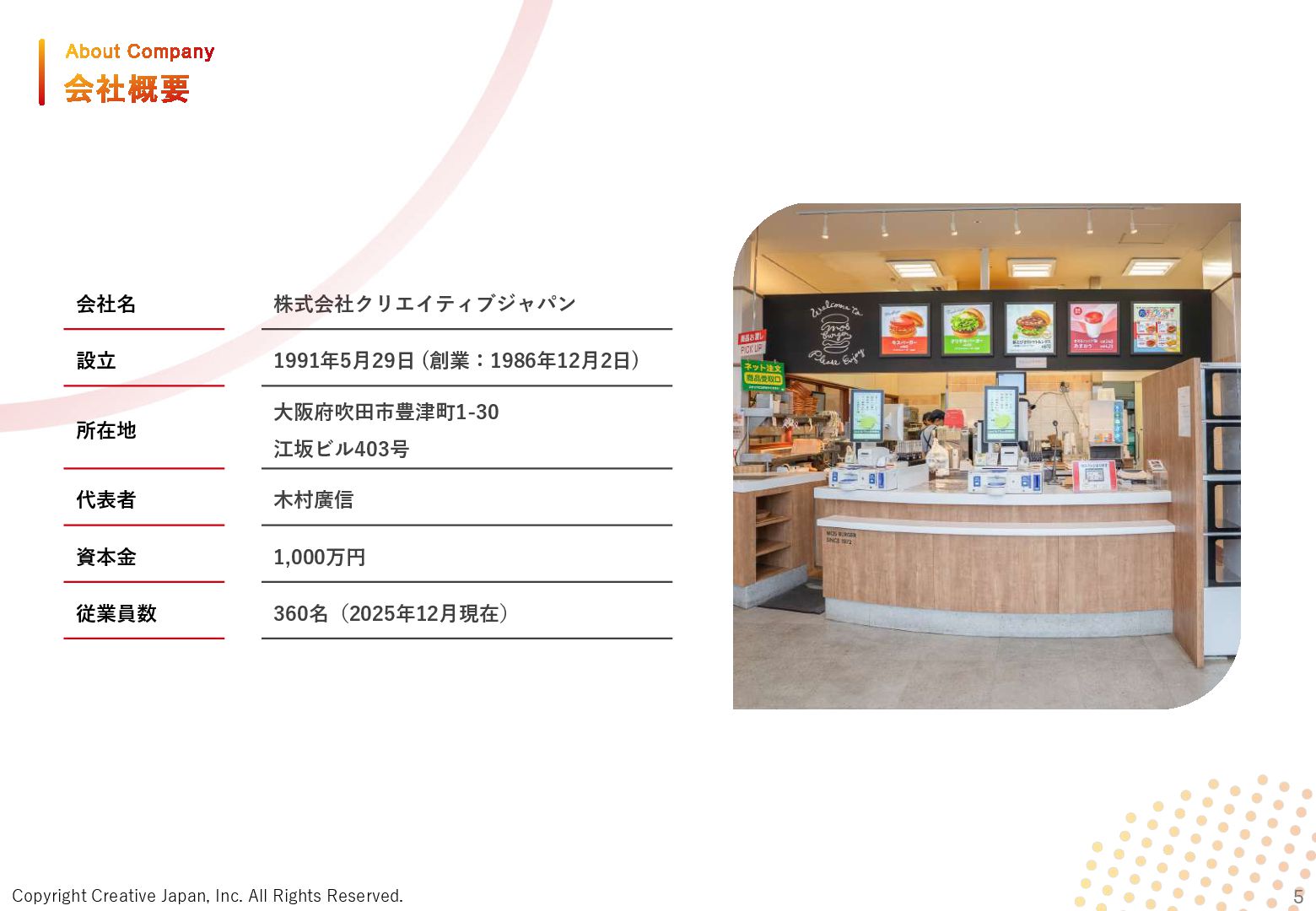 1991年5⽉29⽇ (創業:1986年12⽉2⽇) 所在地 ⼤阪府吹⽥市豊津町1-30 江坂ビル403号 代表者 ⽊村廣信 資本⾦ 1,000万円 従業員数 360名(2025年12⽉現在) 5