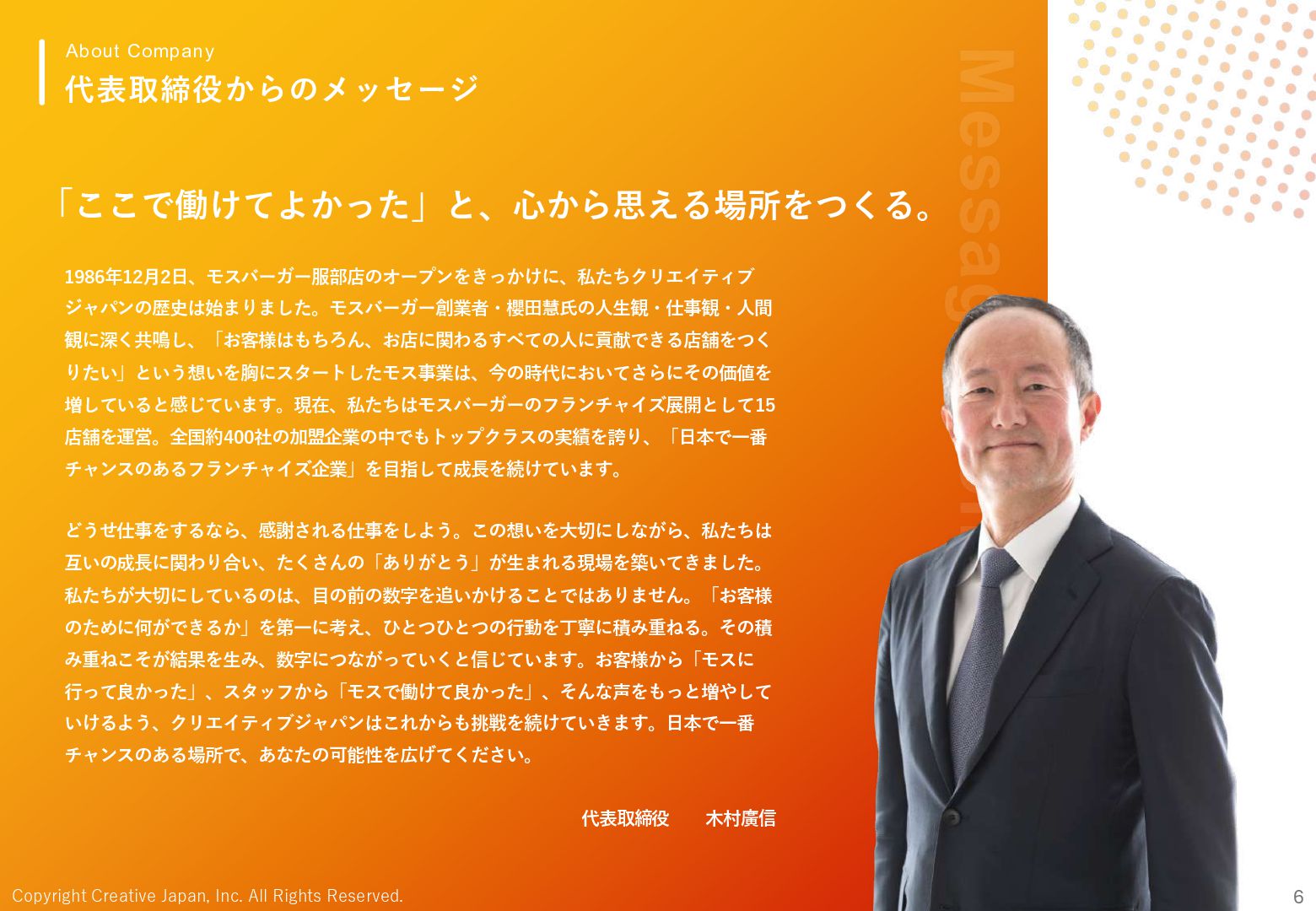 「ここで働けてよかった」と、⼼から思える場所をつくる。 1986年12⽉2⽇、モスバーガー服部店のオープンをきっかけに、私たちクリエイティブ ジャパンの歴史は始まりました。モスバーガー創業者・櫻⽥慧⽒の⼈⽣観・仕事観・⼈間 観に深く共鳴し、「お客様はもちろん、お店に関わるすべての⼈に貢献できる店舗をつく りたい」という想いを胸にスタートしたモス事業は、今の時代においてさらにその価値を 増していると感じています。現在、私たちはモスバーガーのフランチャイズ展開として15 店舗を運営。全国約400社の加盟企業の中でもトップクラスの実績を誇り、「⽇本で⼀番 チャンスのあるフランチャイズ企業」を⽬指して成⻑を続けています。 どうせ仕事をするなら、感謝される仕事をしよう。この想いを⼤切にしながら、私たちは 互いの成⻑に関わり合い、たくさんの「ありがとう」が⽣まれる現場を築いてきました。 私たちが⼤切にしているのは、⽬の前の数字を追いかけることではありません。「お客様 のために何ができるか」を第⼀に考え、ひとつひとつの⾏動を丁寧に積み重ねる。その積 み重ねこそが結果を⽣み、数字につながっていくと信じています。お客様から「モスに ⾏って良かった」、スタッフから「モスで働けて良かった」、そんな声をもっと増やして いけるよう、クリエイティブジャパンはこれからも挑戦を続けていきます。⽇本で⼀番 チャンスのある場所で、あなたの可能性を広げてください。 代表取締役 ⽊村廣信 6