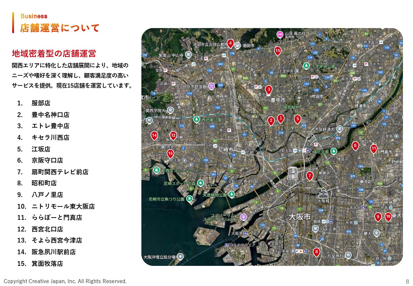 7. Copyright Creative Japan, Inc. All Rights Reserved. 地域密着型の店舗運営 関⻄エリアに特化した店舗展開により、地域の ニーズや嗜好を深く理解し、顧客満⾜度の⾼い