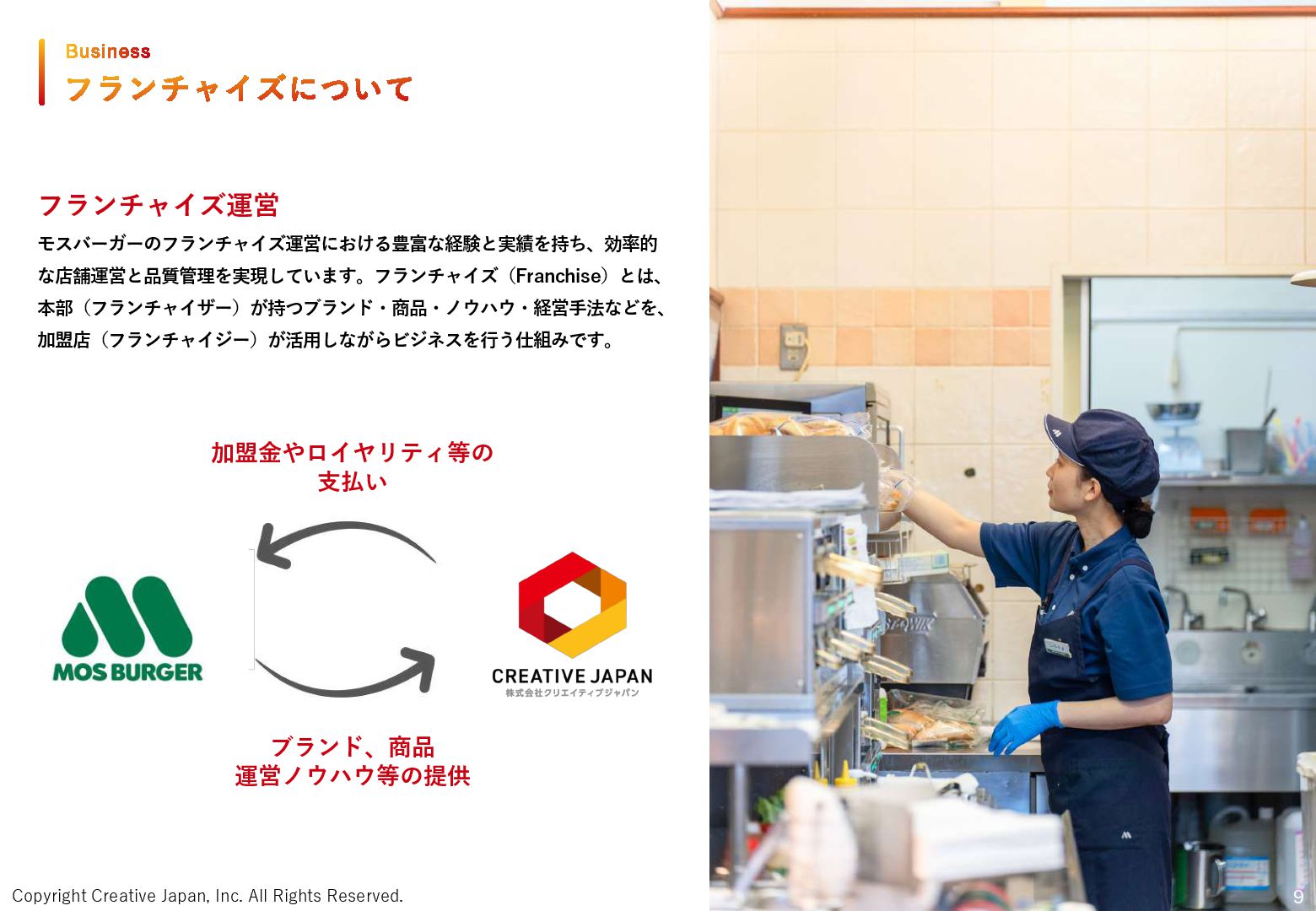 8. Copyright Creative Japan, Inc. All Rights Reserved. フランチャイズ運営 モスバーガーのフランチャイズ運営における豊富な経験と実績を持ち、効率的 な店舗運営と品質管理を実現しています。フランチャイズ(Franchise)とは、