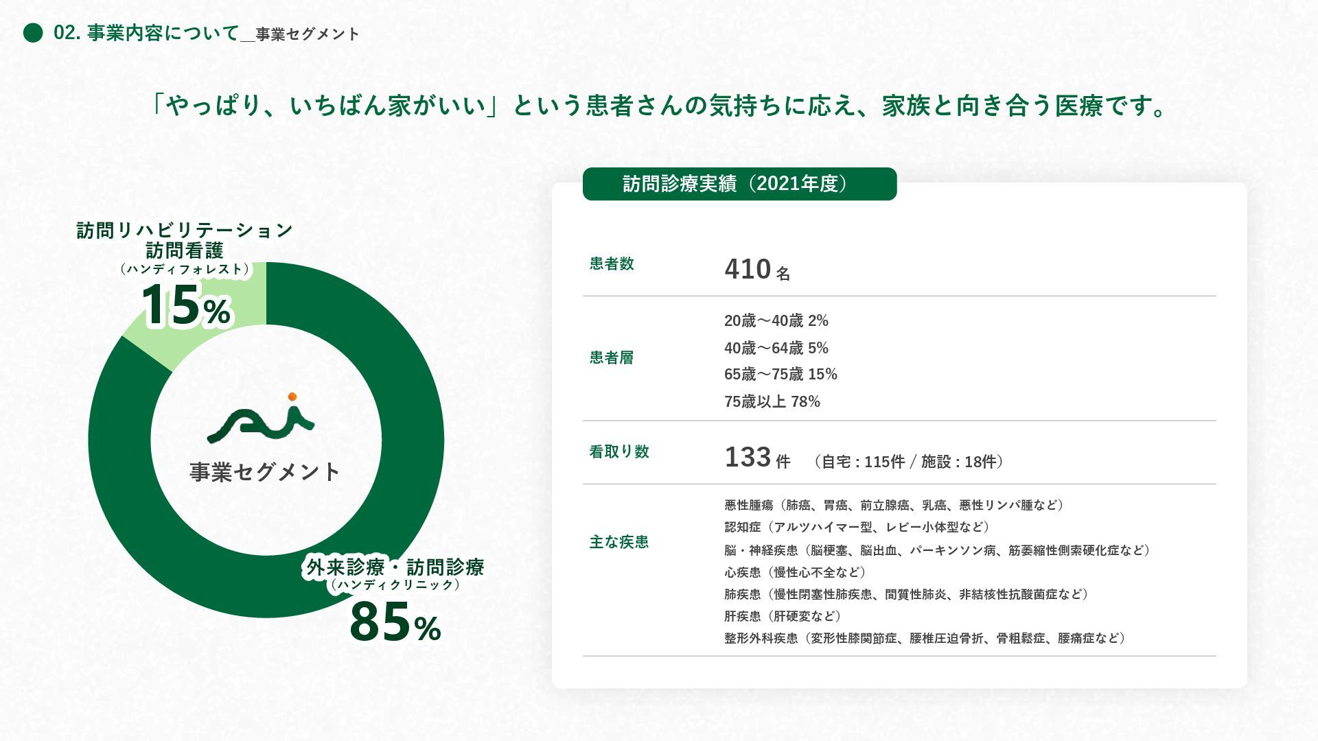 訪問診療実績(2021年度) 患者数 410 名 患者層 20歳〜40歳 2% 40歳〜64歳 5% 65歳〜75歳 15% 75歳以上 78% 看取り数 133 件 (⾃宅 : 115件 / 施設 : 18件) 主な疾患 悪性腫瘍(肺癌、胃癌、前⽴腺癌、乳癌、悪性リンパ腫など) 認知症(アルツハイマー型、レビー⼩体型など) 脳・神経疾患(脳梗塞、脳出⾎、パーキンソン病、筋萎縮性側索硬化症など) ⼼疾患(慢性⼼不全など) 肺疾患(慢性閉塞性肺疾患、間質性肺炎、⾮結核性抗酸菌症など) 肝疾患(肝硬変など) 整形外科疾患(変形性膝関節症、腰椎圧迫⾻折、⾻粗鬆症、腰痛症など) 02. 事業内容について_事業セグメント