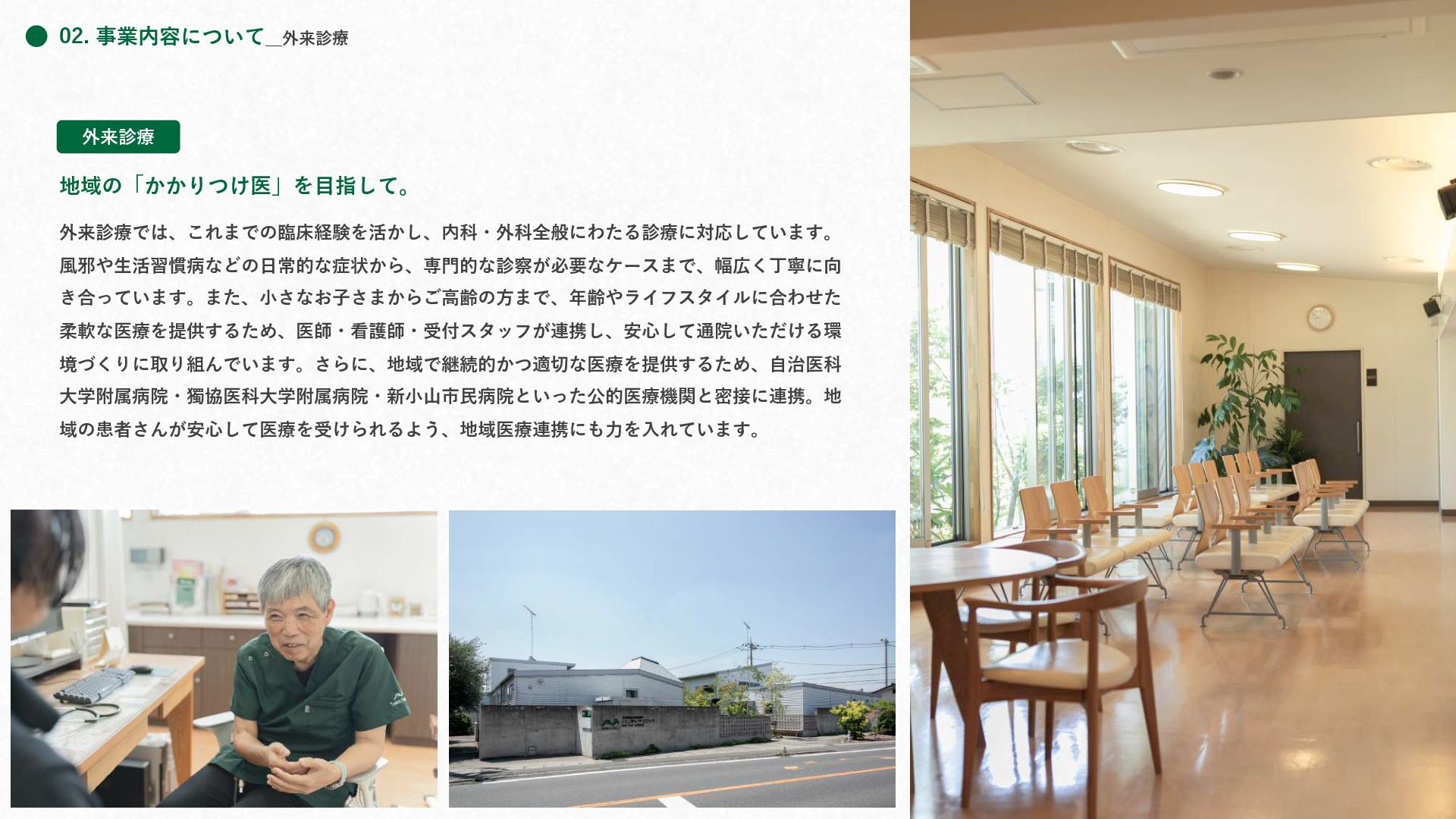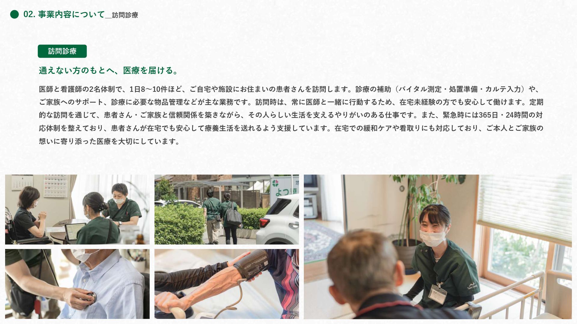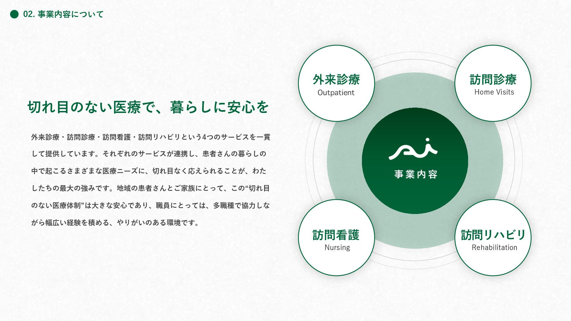 事 業 内 容 外来診療・訪問診療・訪問看護・訪問リハビリという4つのサービスを⼀貫 して提供しています。それぞれのサービスが連携し、患者さんの暮らしの 中で起こるさまざまな医療ニーズに、切れ⽬なく応えられることが、わた したちの最⼤の強みです。地域の患者さんとご家族にとって、この“切れ⽬ のない医療体制”は⼤きな安⼼であり、職員にとっては、多職種で協⼒しな がら幅広い経験を積める、やりがいのある環境です。 02. 事業内容について
