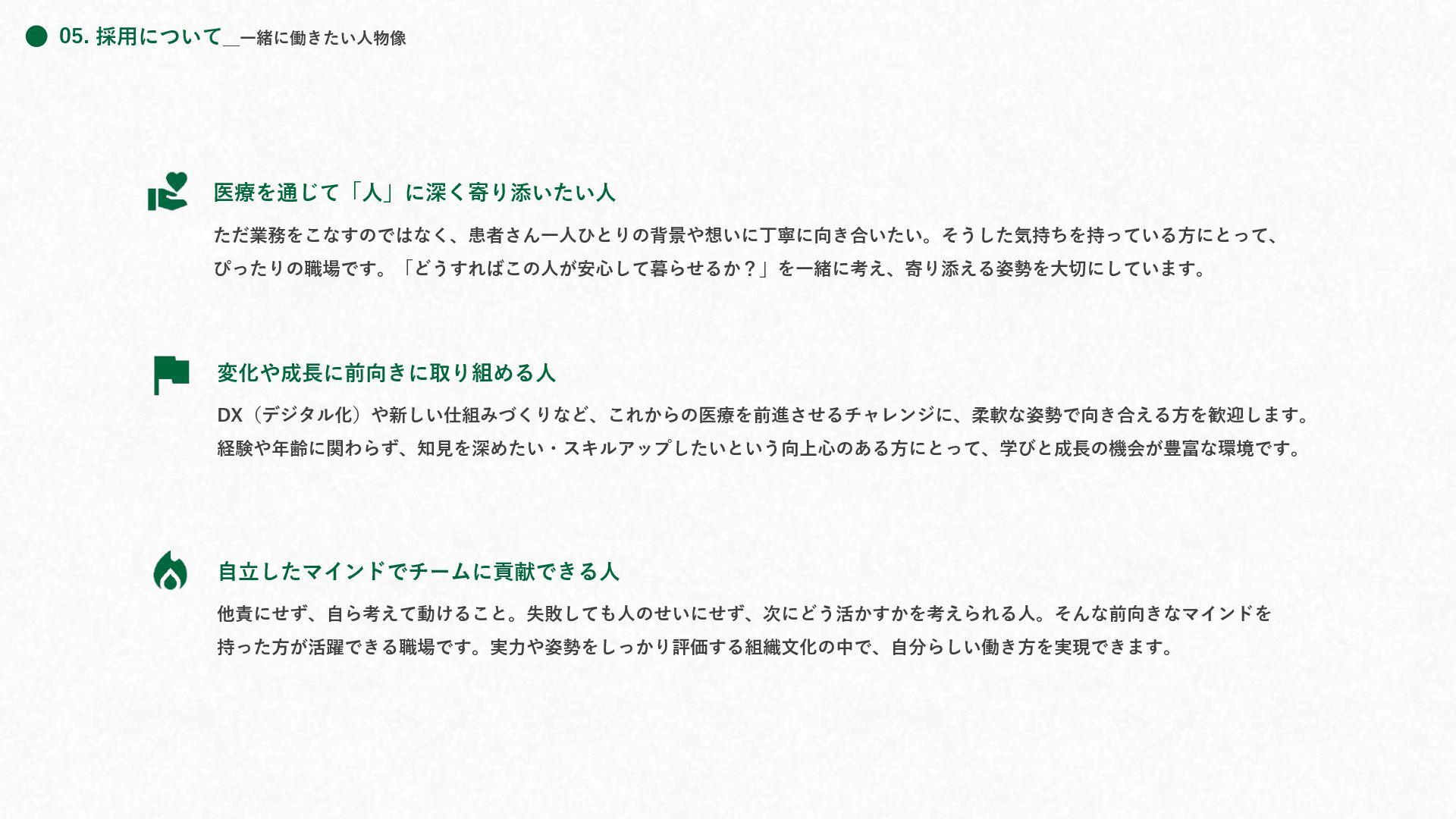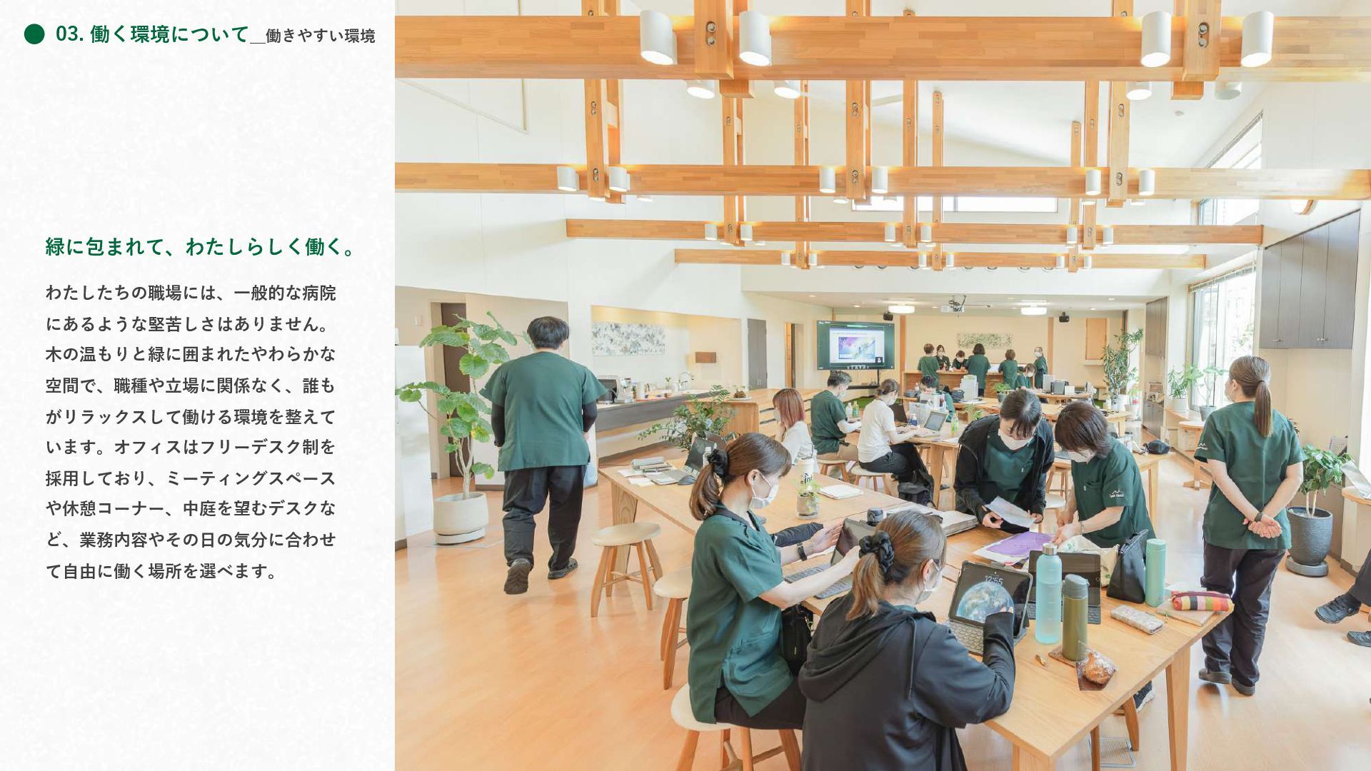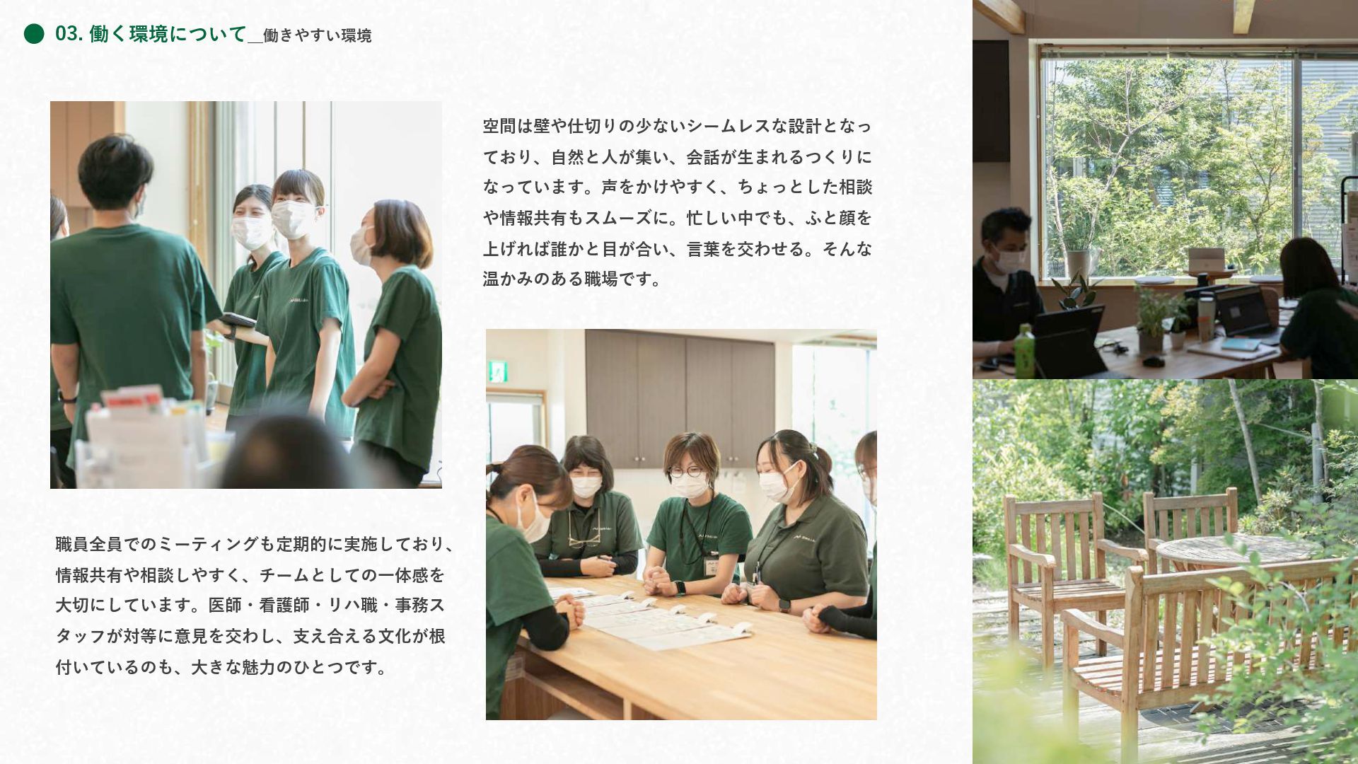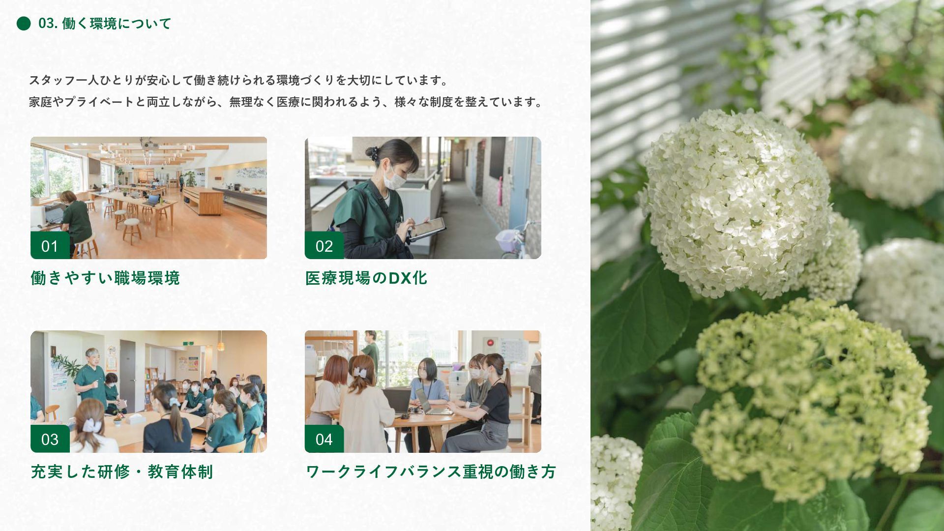 事 業 内 容 外来診療・訪問診療・訪問看護・訪問リハビリという4つのサービスを⼀貫 して提供しています。それぞれのサービスが連携し、患者さんの暮らしの 中で起こるさまざまな医療ニーズに、切れ⽬なく応えられることが、わた したちの最⼤の強みです。地域の患者さんとご家族にとって、この“切れ⽬ のない医療体制”は⼤きな安⼼であり、職員にとっては、多職種で協⼒しな がら幅広い経験を積める、やりがいのある環境です。 02. 事業内容について