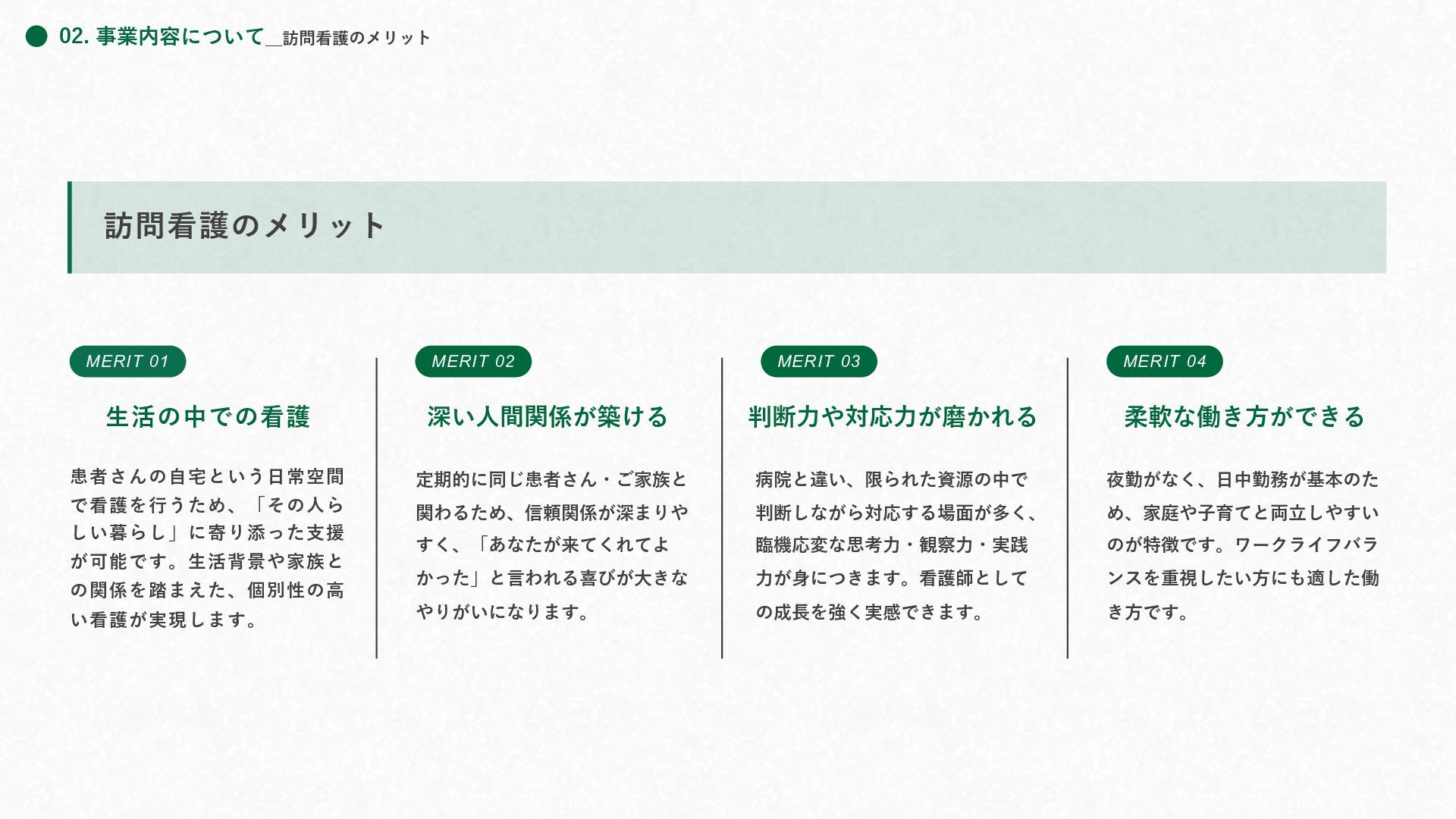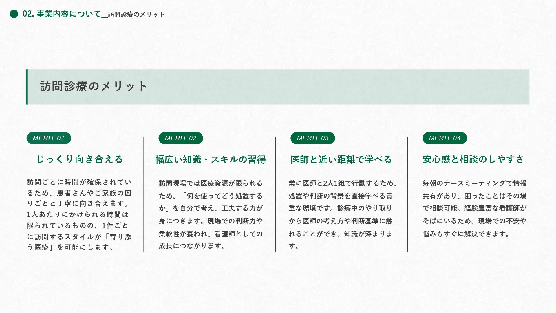 MERIT 02 幅広い知識・スキルの習得 訪問現場では医療資源が限られる ため、「何を使ってどう処置する か」を⾃分で考え、⼯夫する⼒が ⾝につきます。現場での判断⼒や 柔軟性が養われ、看護師としての 成⻑につながります。 MERIT 03 医師と近い距離で学べる 常に医師と2⼈1組で⾏動するため、 処置や判断の背景を直接学べる貴 重な環境です。診療中のやり取り から医師の考え⽅や判断基準に触 れることができ、知識が深まりま す。 MERIT 04 安⼼感と相談のしやすさ 毎朝のナースミーティングで情報 共有があり、困ったことはその場 で相談可能。経験豊富な看護師が そばにいるため、現場での不安や 悩みもすぐに解決できます。 訪問診療のメリット 02. 事業内容について_訪問診療のメリット