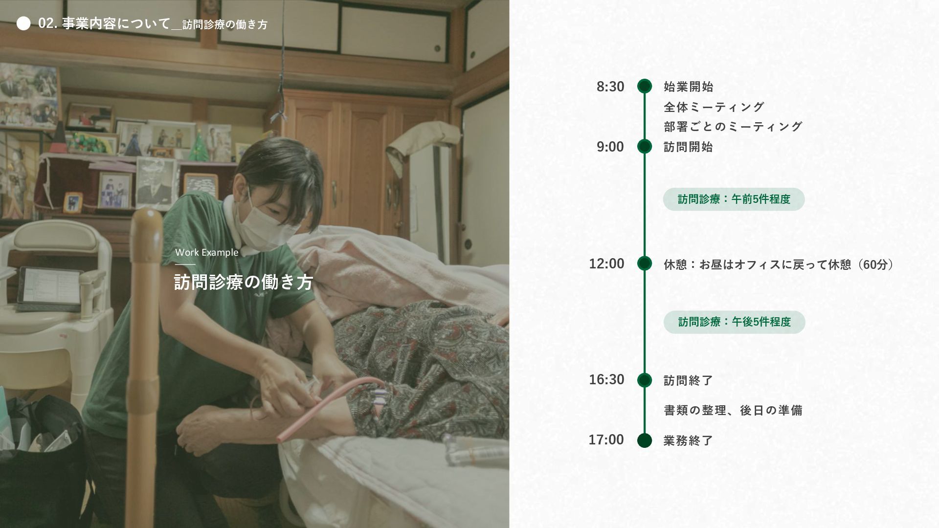 訪問開始 9:00 業務終了 17:00 16:30 訪問終了 書類の整理、後⽇の準備 休憩:お昼はオフィスに戻って休憩(60分) 訪問診療:午後5件程度 12:00