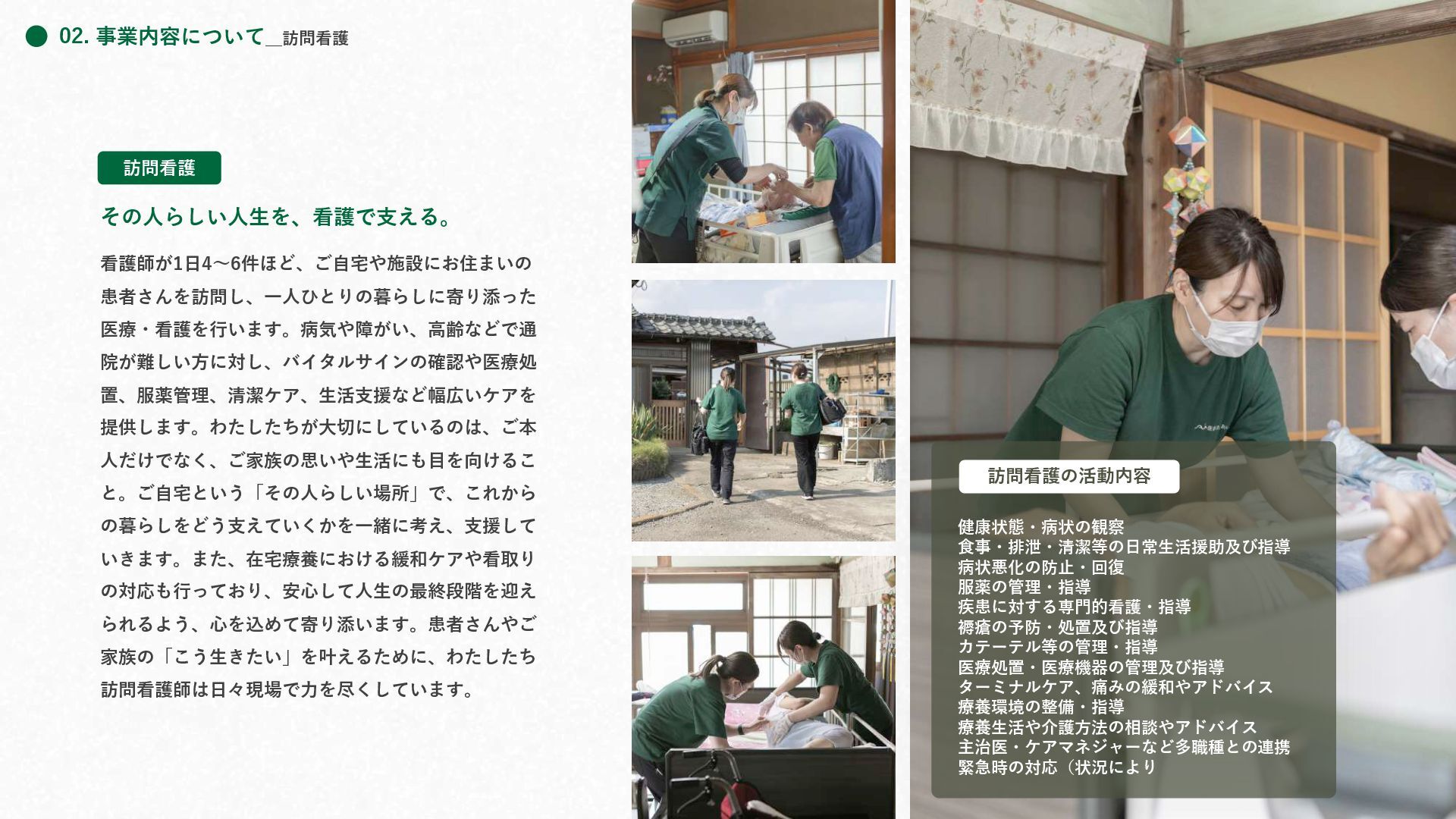10. 02. 事業内容について_訪問看護 その⼈らしい⼈⽣を、看護で⽀える。 看護師が1⽇4〜6件ほど、ご⾃宅や施設にお住まいの 患者さんを訪問し、⼀⼈ひとりの暮らしに寄り添った 医療・看護を⾏います。病気や障がい、⾼齢などで通 院が難しい⽅に対し、バイタルサインの確認や医療処 置、服薬管理、清潔ケア、⽣活⽀援など幅広いケアを 提供します。わたしたちが⼤切にしているのは、ご本 ⼈だけでなく、ご家族の思いや⽣活にも⽬を向けるこ
