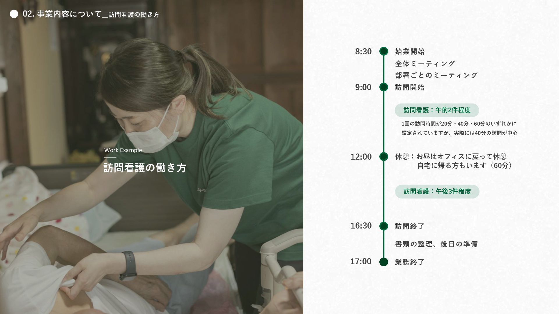 12. 02. 事業内容について_訪問看護の働き⽅ 訪問看護の働き⽅ Work Example 始業開始 訪問看護:午前2件程度 8:30 全体ミーティング 部署ごとのミーティング