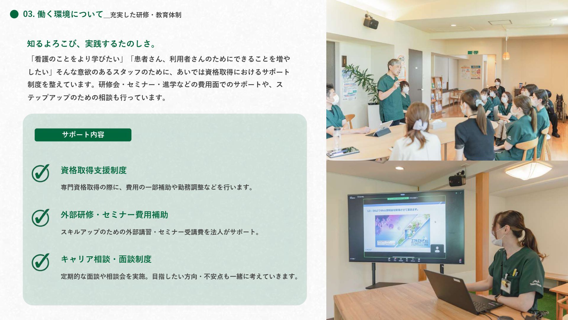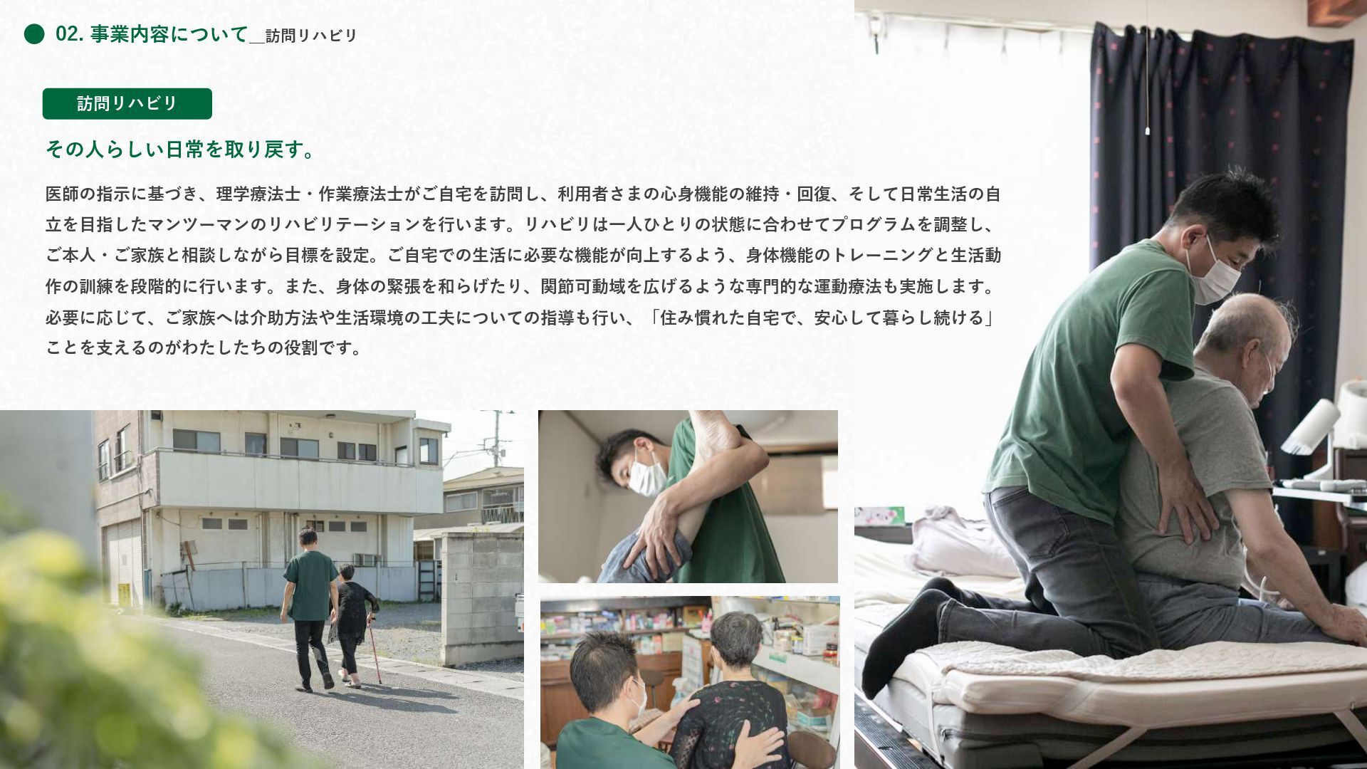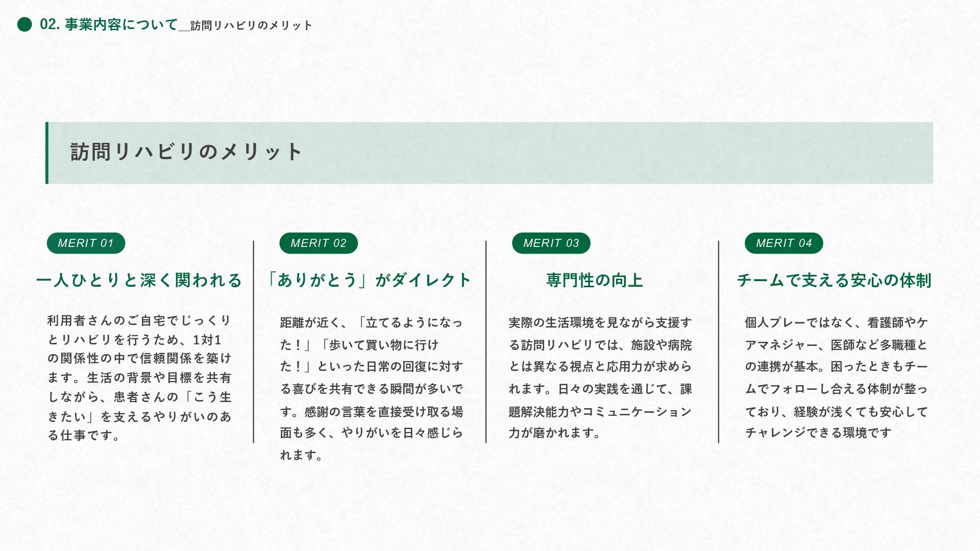 MERIT 02 「ありがとう」がダイレクト 距離が近く、「⽴てるようになっ た!」「歩いて買い物に⾏け た!」といった⽇常の回復に対す る喜びを共有できる瞬間が多いで す。感謝の⾔葉を直接受け取る場 ⾯も多く、やりがいを⽇々感じら れます。 MERIT 03 専⾨性の向上 実際の⽣活環境を⾒ながら⽀援す る訪問リハビリでは、施設や病院 とは異なる視点と応⽤⼒が求めら れます。⽇々の実践を通じて、課 題解決能⼒やコミュニケーション ⼒が磨かれます。 MERIT 04 チームで⽀える安⼼の体制 個⼈プレーではなく、看護師やケ アマネジャー、医師など多職種と の連携が基本。困ったときもチー ムでフォローし合える体制が整っ ており、経験が浅くても安⼼して チャレンジできる環境です 訪問リハビリのメリット 02. 事業内容について_訪問リハビリのメリット