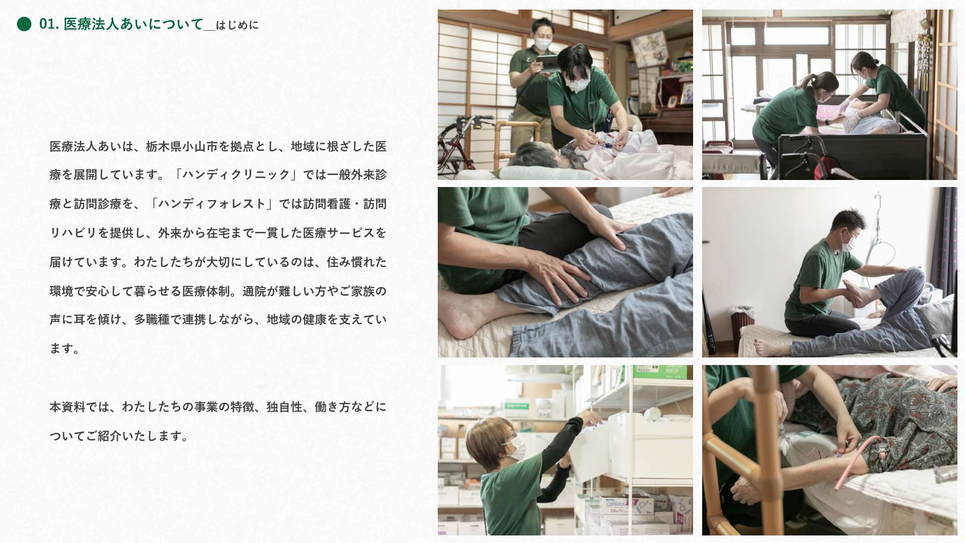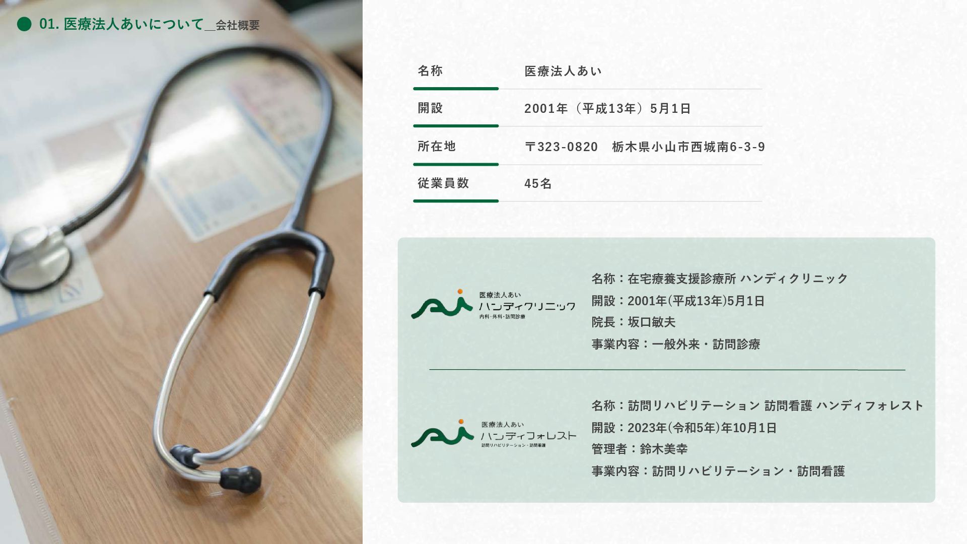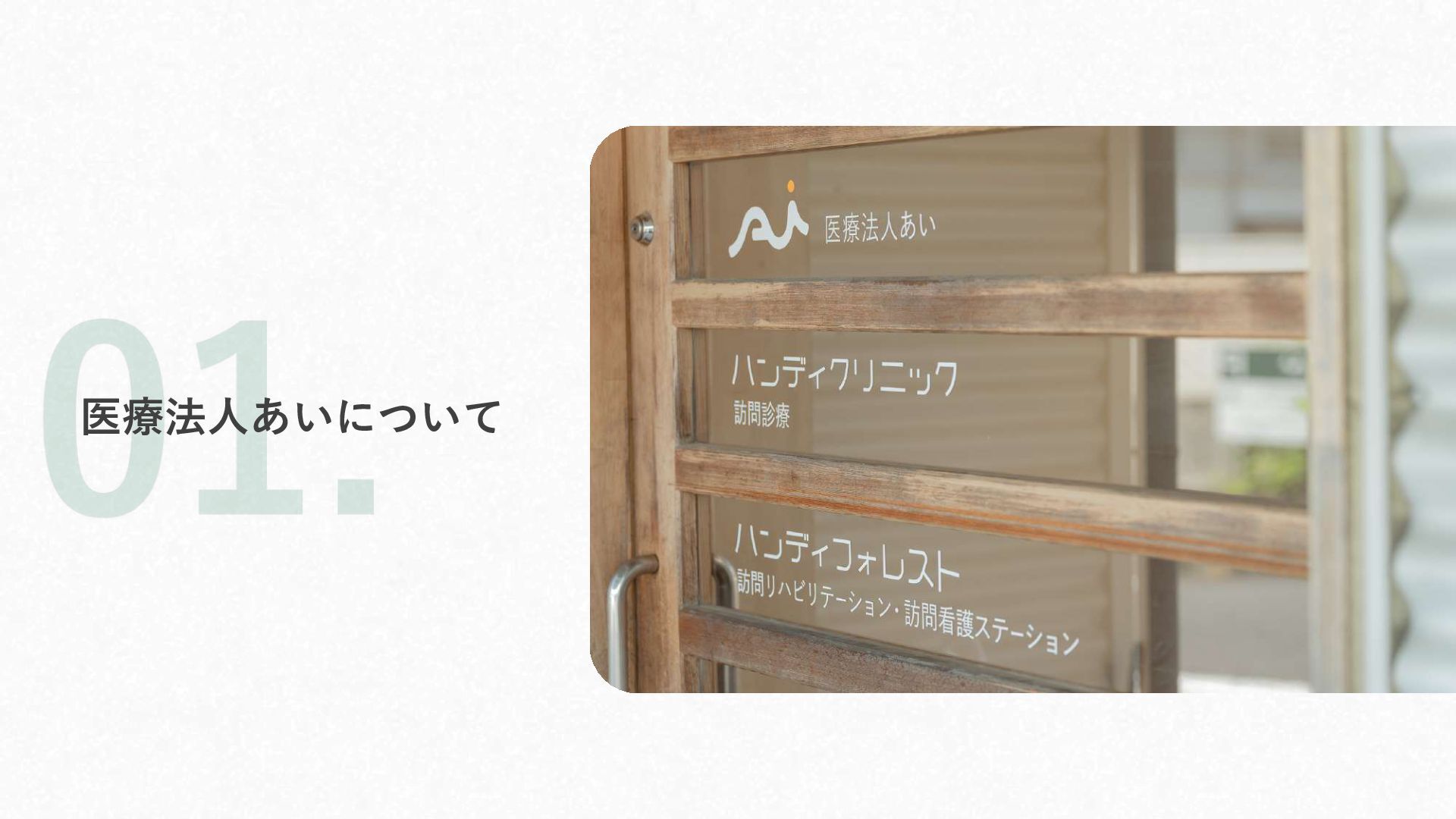 訪問看護 ハンディフォレスト 開設:2023年(令和5年)年10⽉1⽇ 管理者:鈴⽊美幸 事業内容:訪問リハビリテーション・訪問看護 名称:在宅療養⽀援診療所 ハンディクリニック 開設:2001年(平成13年)5⽉1⽇ 院⻑:坂⼝敏夫 事業内容:⼀般外来・訪問診療 01. 医療法⼈あいについて_会社概要