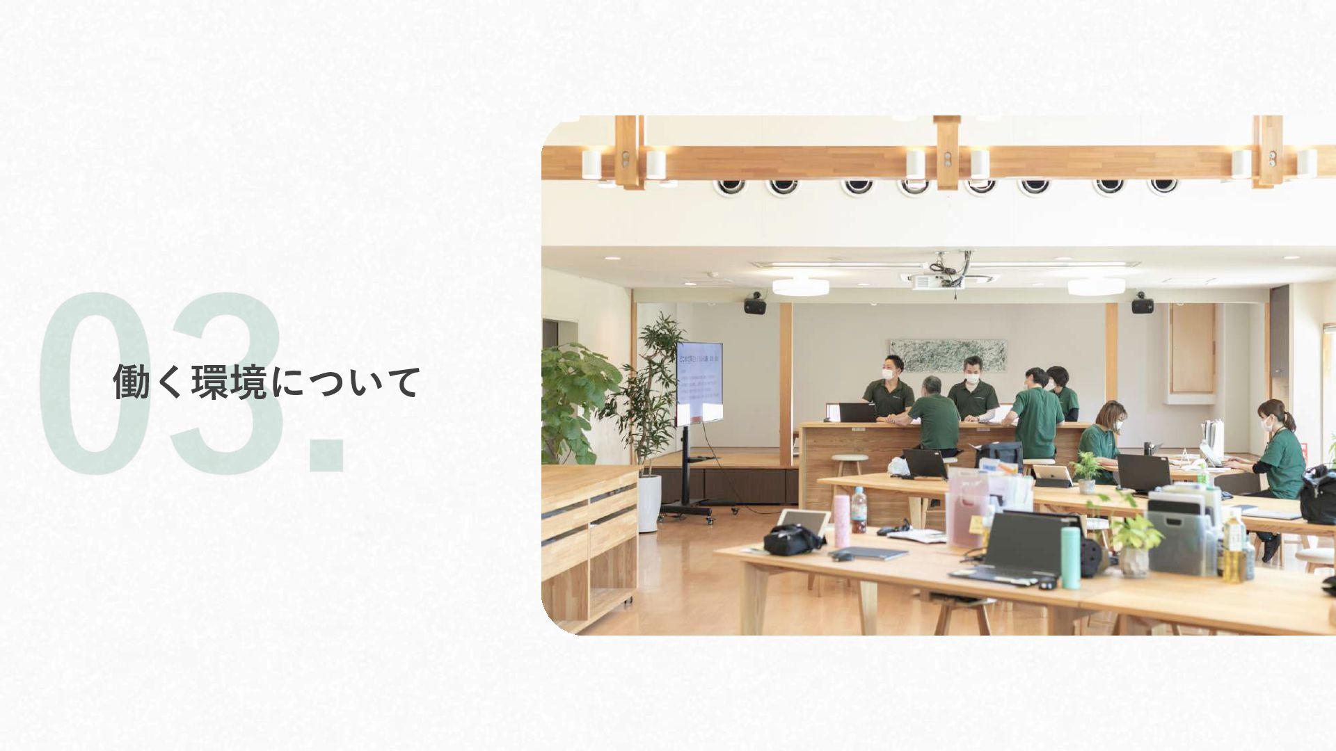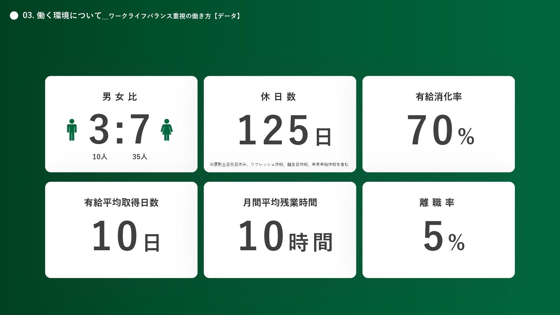 70% 有給消化率 10⽇ 有給平均取得⽇数 10時 間 ⽉間平均残業時間 5% 離 職 率 ※原則⼟⽇祝⽇休み、リフレッシュ休暇、誕⽣⽇休暇、年末年始休暇を含む 03. 働く環境について_ワークライフバランス重視の働き⽅【データ】