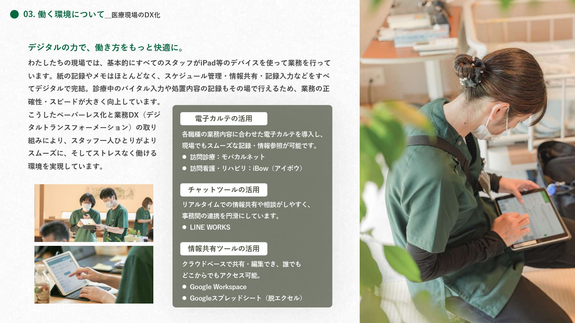 03. 働く環境について_医療現場のDX化 クラウドベースで共有・編集でき、誰でも どこからでもアクセス可能。 l Google Workspace l Googleスプレッドシート(脱エクセル) 電⼦カルテの活⽤ 各職種の業務内容に合わせた電⼦カルテを導⼊し、 現場でもスムーズな記録・情報参照が可能です。 l 訪問診療:モバカルネット l 訪問看護・リハビリ:iBow(アイボウ) チャットツールの活⽤ リアルタイムでの情報共有や相談がしやすく、 事務間の連携を円滑にしています。 l LINE WORKS 情報共有ツールの活⽤
