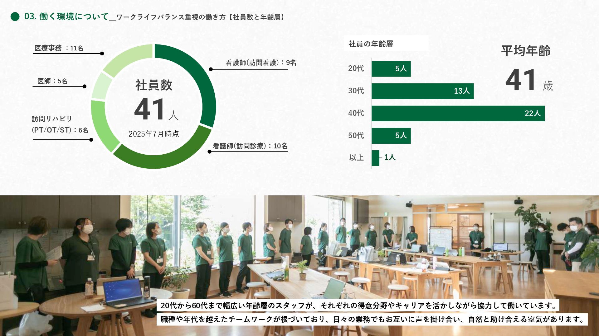 社員の年齢層 20代から60代まで幅広い年齢層のスタッフが、それぞれの得意分野やキャリアを活かしながら協⼒して働いています。 職種や年代を越えたチームワークが根づいており、⽇々の業務でもお互いに声を掛け合い、⾃然と助け合える空気があります。 41 ⼈ 社員数 2025年7⽉時点 看護師(訪問看護):9名 看護師(訪問診療):10名 医師:5名 医療事務 :11名 訪問リハビリ (PT/OT/ST):6名 41 歳 平均年齢 03. 働く環境について_ワークライフバランス重視の働き⽅【社員数と年齢層】