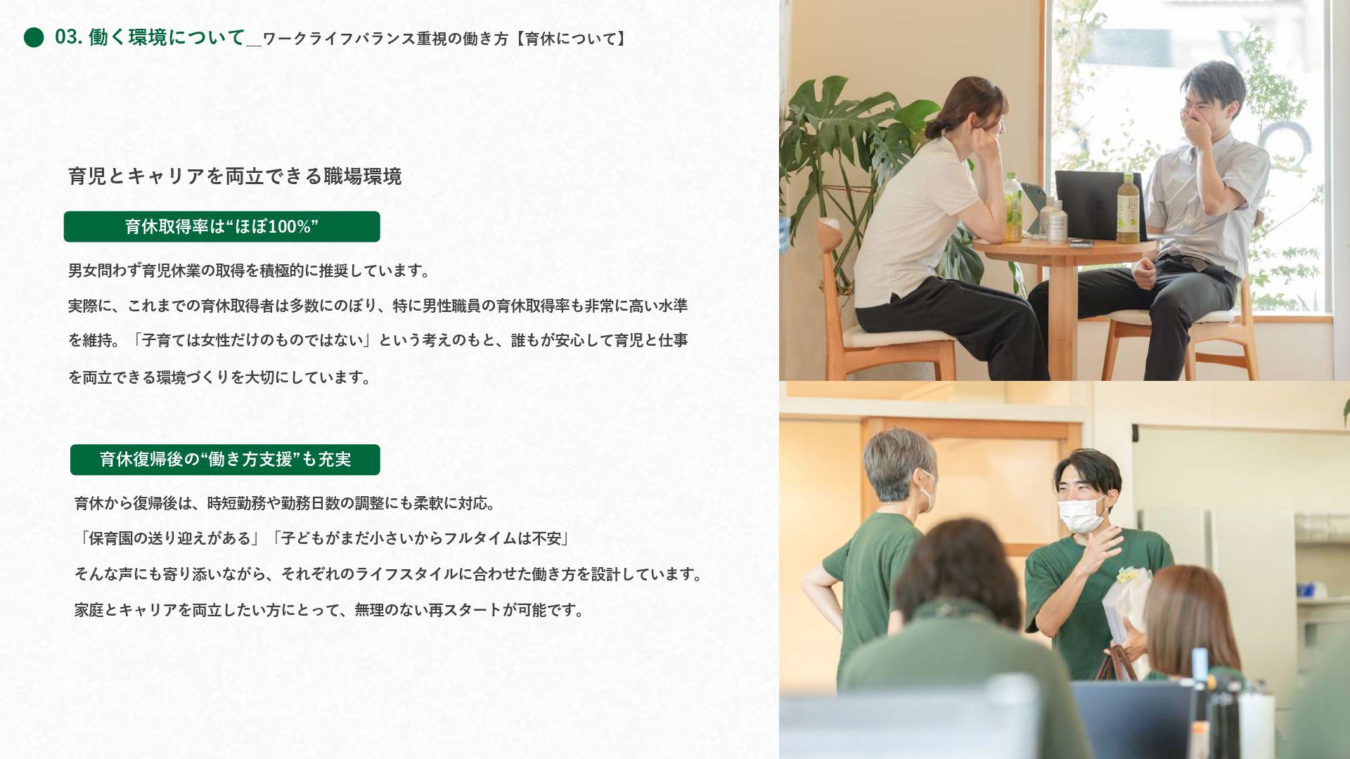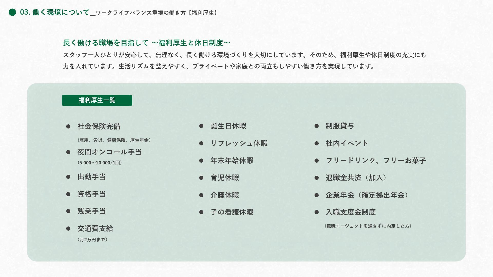 l 残業⼿当 l 交通費⽀給 (⽉2万円まで) l 制服貸与 l 社内イベント l フリードリンク、フリーお菓⼦ l 退職⾦共済(加⼊) l 企業年⾦(確定拠出年⾦) l ⼊職⽀度⾦制度 (転職エージェントを通さずに内定した⽅) l 誕⽣⽇休暇 l リフレッシュ休暇 l 年末年始休暇 l 育児休暇 l 介護休暇 l ⼦の看護休暇 ⻑く働ける職場を⽬指して 〜福利厚⽣と休⽇制度〜 スタッフ⼀⼈ひとりが安⼼して、無理なく、⻑く働ける環境づくりを⼤切にしています。そのため、福利厚⽣や休⽇制度の充実にも ⼒を⼊れています。⽣活リズムを整えやすく、プライベートや家庭との両⽴もしやすい働き⽅を実現しています。 03. 働く環境について_ワークライフバランス重視の働き⽅【福利厚⽣】 福利厚⽣⼀覧