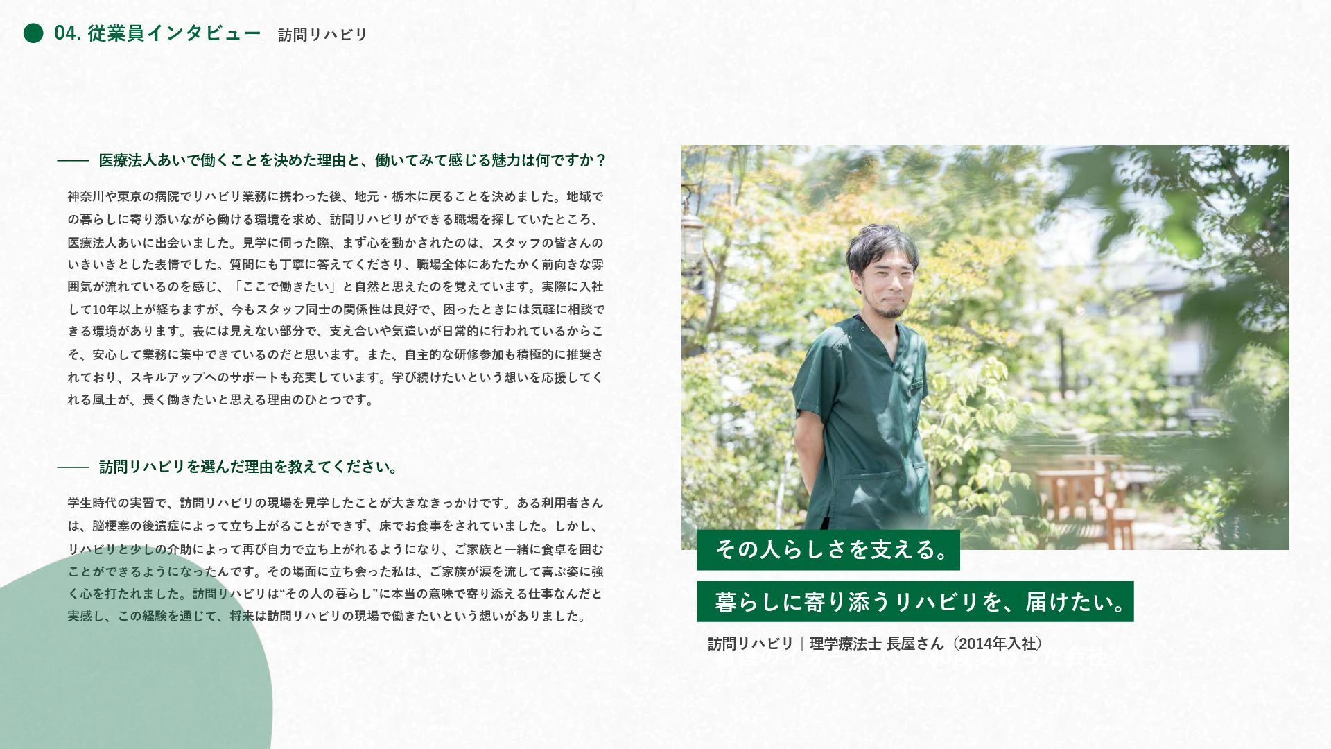 19. その⼈らしさを⽀える。 暮らしに寄り添うリハビリを、届けたい。 看護のイメージが、180度変わった会社。 04. 従業員インタビュー_訪問リハビリ 訪問リハビリ|理学療法⼠ ⻑屋さん(2014年⼊社) 医療法⼈あいで働くことを決めた理由と、働いてみて感じる魅⼒は何ですか? 神奈川や東京の病院でリハビリ業務に携わった後、地元・栃⽊に戻ることを決めました。地域で の暮らしに寄り添いながら働ける環境を求め、訪問リハビリができる職場を探していたところ、