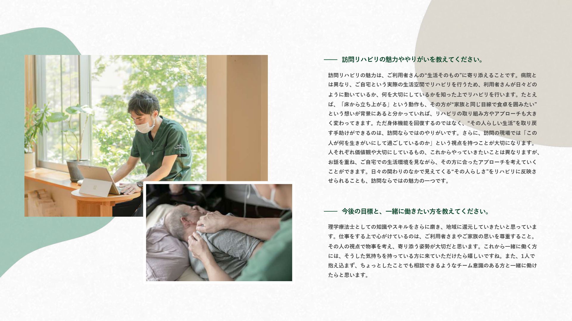 お話を重ね、ご⾃宅での⽣活環境を⾒ながら、その⽅に合ったアプローチを考えていく ことができます。⽇々の関わりのなかで⾒えてくる“その⼈らしさ”をリハビリに反映さ せられることも、訪問ならではの魅⼒の⼀つです。 今後の⽬標と、⼀緒に働きたい⽅を教えてください。 理学療法⼠としての知識やスキルをさらに磨き、地域に還元していきたいと思っていま す。仕事をする上で⼼がけているのは、ご利⽤者さまやご家族の思いを尊重すること。 その⼈の視点で物事を考え、寄り添う姿勢が⼤切だと思います。これから⼀緒に働く⽅ には、そうした気持ちを持っている⽅に来ていただけたら嬉しいですね。また、1⼈で 抱え込まず、ちょっとしたことでも相談できるようなチーム意識のある⽅と⼀緒に働け たらと思います。