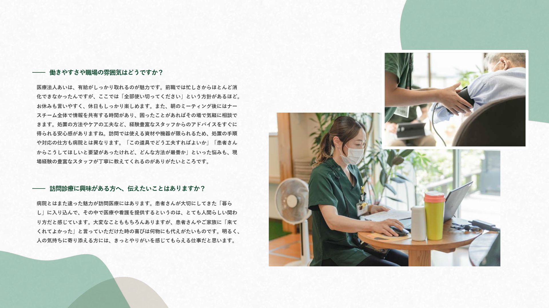 22. 働きやすさや職場の雰囲気はどうですか? 医療法⼈あいは、有給がしっかり取れるのが魅⼒です。前職では忙しさからほとんど消 化できなかったんですが、ここでは「全部使い切ってください」という⽅針があるほど。 お休みも⾔いやすく、休⽇もしっかり楽しめます。また、朝のミーティング後にはナー スチーム全体で情報を共有する時間があり、困ったことがあればその場で気軽に相談で きます。処置の⽅法やケアの⼯夫など、経験豊富なスタッフからのアドバイスをすぐに 得られる安⼼感がありますね。訪問では使える資材や機器が限られるため、処置の⼿順 や対応の仕⽅も病院とは異なります。「この道具でどう⼯夫すればよいか」「患者さん からこうしてほしいと要望があったけれど、どんな⽅法が最善か」といった悩みも、現 場経験の豊富なスタッフが丁寧に教えてくれるのがありがたいところです。