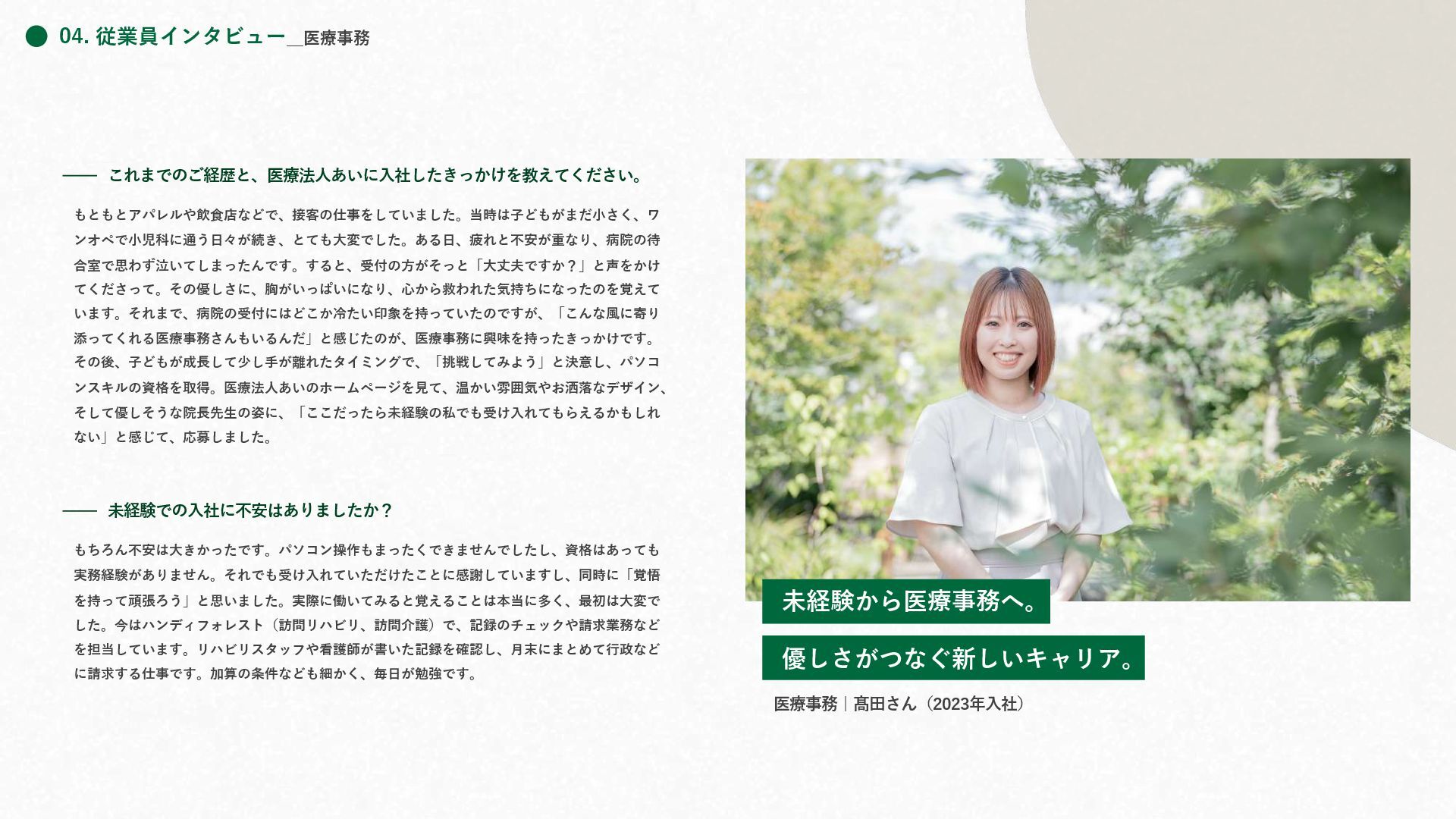 23. 未経験から医療事務へ。 優しさがつなぐ新しいキャリア。 04. 従業員インタビュー_医療事務 医療事務|髙⽥さん(2023年⼊社) これまでのご経歴と、医療法⼈あいに⼊社したきっかけを教えてください。 もともとアパレルや飲⾷店などで、接客の仕事をしていました。当時は⼦どもがまだ⼩さく、ワ ンオペで⼩児科に通う⽇々が続き、とても⼤変でした。ある⽇、疲れと不安が重なり、病院の待 合室で思わず泣いてしまったんです。すると、受付の⽅がそっと「⼤丈夫ですか?」と声をかけ てくださって。その優しさに、胸がいっぱいになり、⼼から救われた気持ちになったのを覚えて