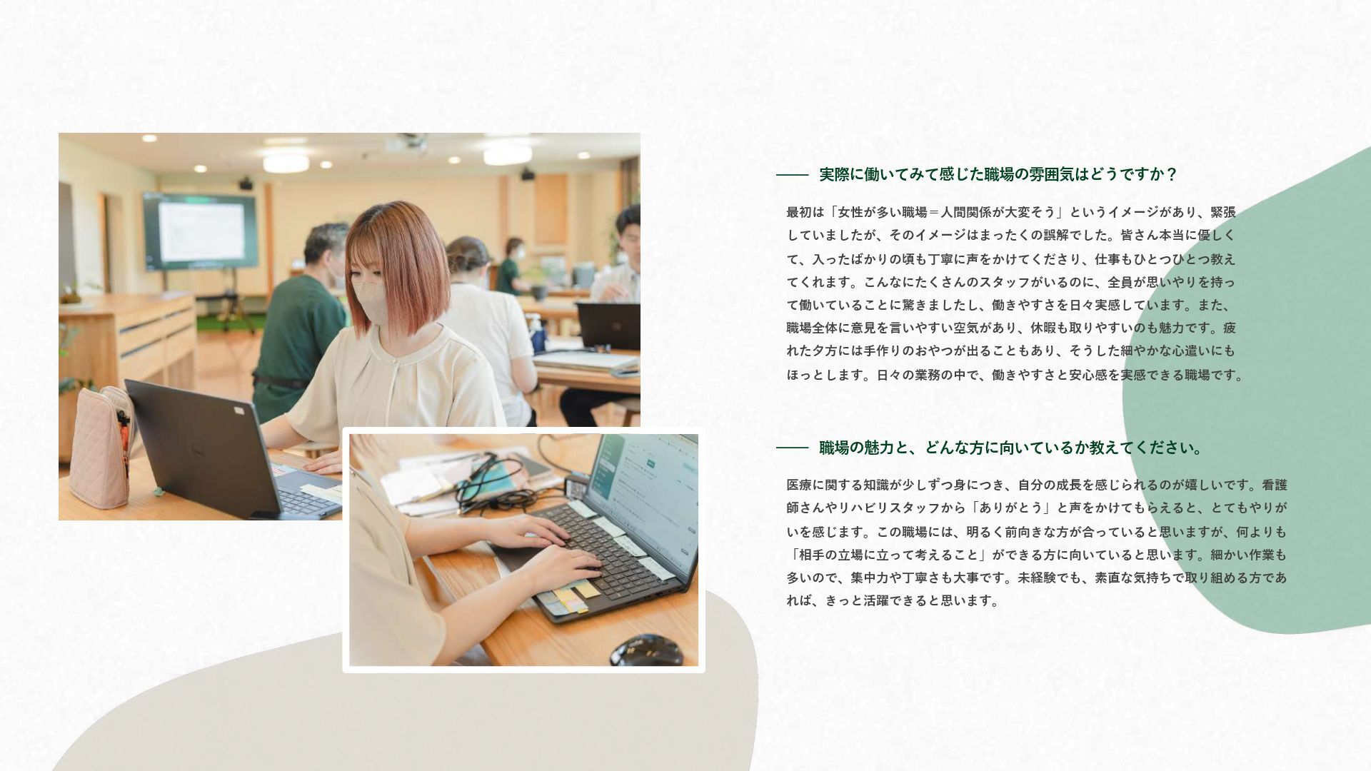 います。それまで、病院の受付にはどこか冷たい印象を持っていたのですが、「こんな⾵に寄り 添ってくれる医療事務さんもいるんだ」と感じたのが、医療事務に興味を持ったきっかけです。 その後、⼦どもが成⻑して少し⼿が離れたタイミングで、「挑戦してみよう」と決意し、パソコ ンスキルの資格を取得。医療法⼈あいのホームページを⾒て、温かい雰囲気やお洒落なデザイン、 そして優しそうな院⻑先⽣の姿に、「ここだったら未経験の私でも受け⼊れてもらえるかもしれ ない」と感じて、応募しました。 未経験での⼊社に不安はありましたか? もちろん不安は⼤きかったです。パソコン操作もまったくできませんでしたし、資格はあっても 実務経験がありません。それでも受け⼊れていただけたことに感謝していますし、同時に「覚悟 を持って頑張ろう」と思いました。実際に働いてみると覚えることは本当に多く、最初は⼤変で した。今はハンディフォレスト(訪問リハビリ、訪問介護)で、記録のチェックや請求業務など を担当しています。リハビリスタッフや看護師が書いた記録を確認し、⽉末にまとめて⾏政など に請求する仕事です。加算の条件なども細かく、毎⽇が勉強です。