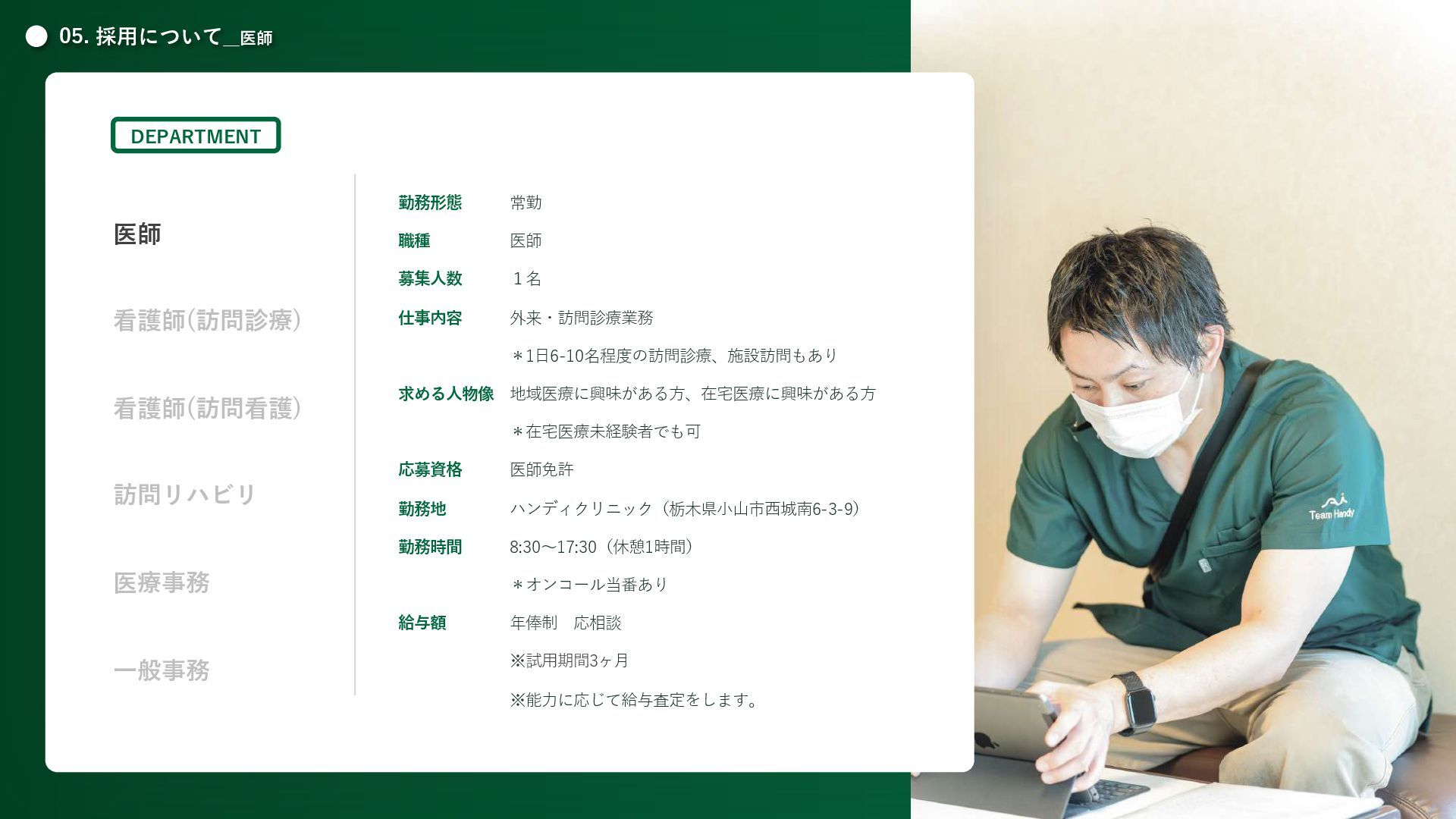 医師 募集⼈数 1名 仕事内容 外来・訪問診療業務 *1⽇6-10名程度の訪問診療、施設訪問もあり 求める⼈物像 地域医療に興味がある⽅、在宅医療に興味がある⽅ *在宅医療未経験者でも可 応募資格 医師免許 勤務地 ハンディクリニック(栃⽊県⼩⼭市⻄城南6-3-9) 勤務時間 8:30〜17:30(休憩1時間) *オンコール当番あり 給与額 年俸制 応相談 ※試⽤期間3ヶ⽉ ※能⼒に応じて給与査定をします。 05. 採⽤について_医師