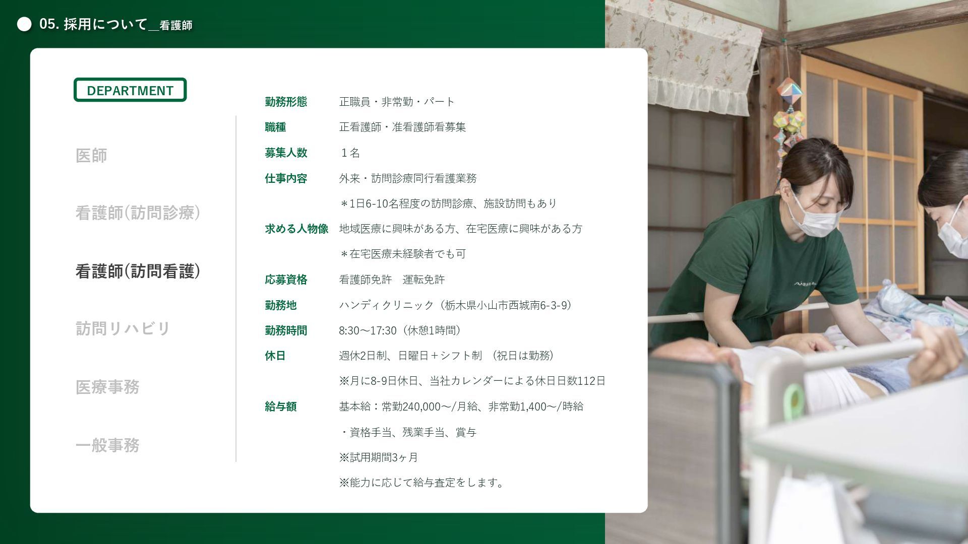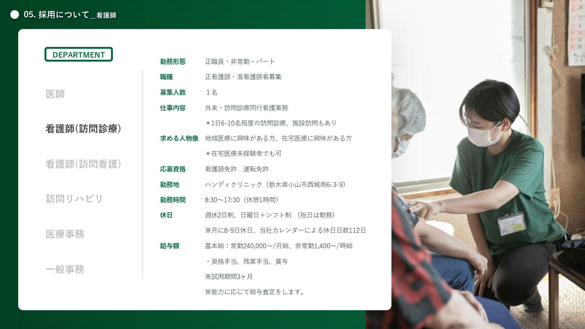 求める⼈物像 地域医療に興味がある⽅、在宅医療に興味がある⽅ *在宅医療未経験者でも可 応募資格 看護師免許 運転免許 勤務地 ハンディクリニック(栃⽊県⼩⼭市⻄城南6-3-9) 勤務時間 8:30〜17:30(休憩1時間) 休⽇ 週休2⽇制、⽇曜⽇+シフト制 (祝⽇は勤務) ※⽉に8-9⽇休⽇、当社カレンダーによる休⽇⽇数112⽇ 給与額 基本給:常勤240,000〜/⽉給、⾮常勤1,400〜/時給 ・資格⼿当、残業⼿当、賞与 ※試⽤期間3ヶ⽉ ※能⼒に応じて給与査定をします。 医師 看護師(訪問診療) 看護師(訪問看護) 訪問リハビリ 医療事務 ⼀般事務 05. 採⽤について_看護師