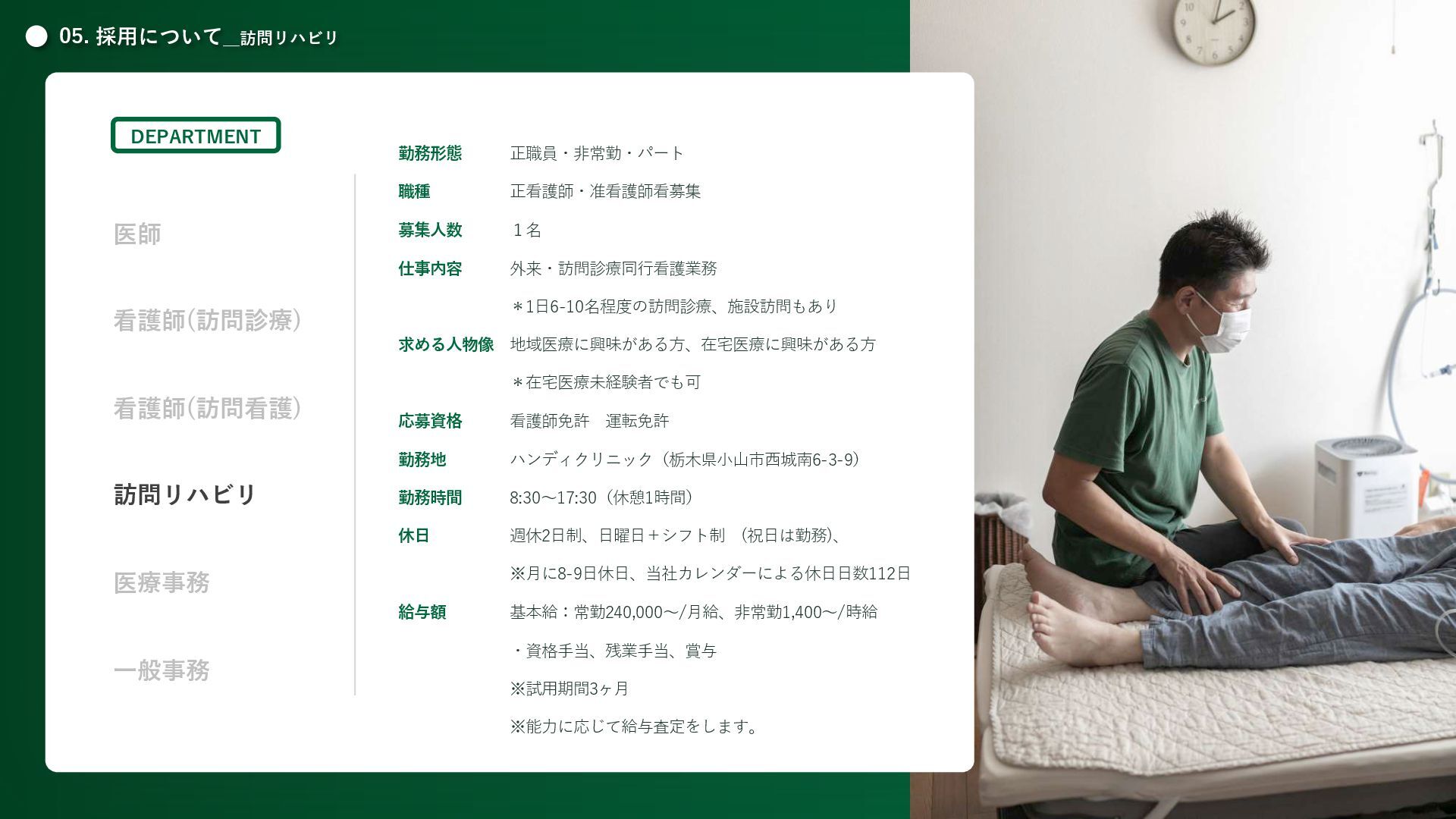 求める⼈物像 地域医療に興味がある⽅、在宅医療に興味がある⽅ *在宅医療未経験者でも可 応募資格 看護師免許 運転免許 勤務地 ハンディクリニック(栃⽊県⼩⼭市⻄城南6-3-9) 勤務時間 8:30〜17:30(休憩1時間) 休⽇ 週休2⽇制、⽇曜⽇+シフト制 (祝⽇は勤務)、 ※⽉に8-9⽇休⽇、当社カレンダーによる休⽇⽇数112⽇ 給与額 基本給:常勤240,000〜/⽉給、⾮常勤1,400〜/時給 ・資格⼿当、残業⼿当、賞与 ※試⽤期間3ヶ⽉ ※能⼒に応じて給与査定をします。 医師 看護師(訪問診療) 看護師(訪問看護) 訪問リハビリ 医療事務 ⼀般事務 05. 採⽤について_訪問リハビリ
