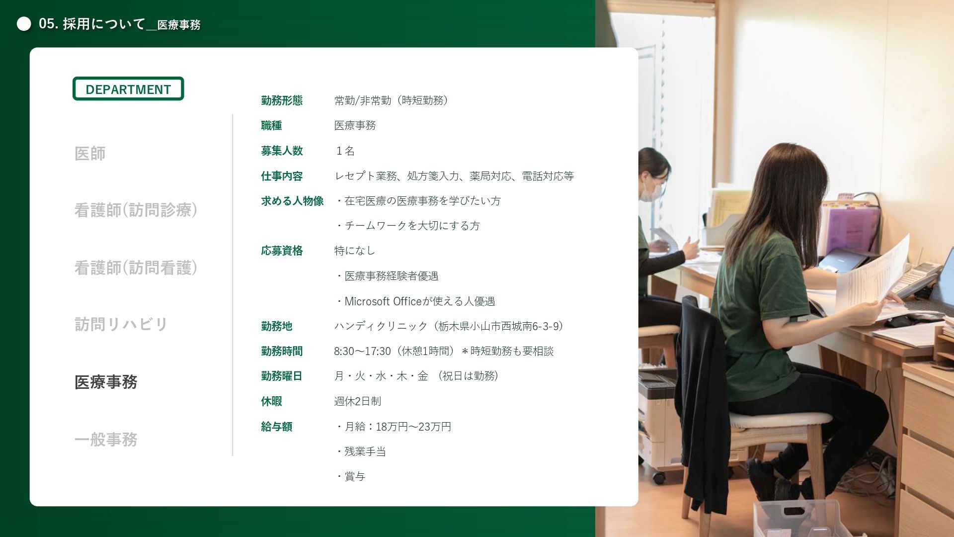 ・在宅医療の医療事務を学びたい⽅ ・チームワークを⼤切にする⽅ 応募資格 特になし ・医療事務経験者優遇 ・Microsoft Officeが使える⼈優遇 勤務地 ハンディクリニック(栃⽊県⼩⼭市⻄城南6-3-9) 勤務時間 8:30〜17:30(休憩1時間)*時短勤務も要相談 勤務曜⽇ ⽉・⽕・⽔・⽊・⾦ (祝⽇は勤務) 休暇 週休2⽇制 給与額 ・⽉給:18万円〜23万円 ・残業⼿当 ・賞与 医師 看護師(訪問診療) 看護師(訪問看護) 訪問リハビリ 医療事務 ⼀般事務 05. 採⽤について_医療事務