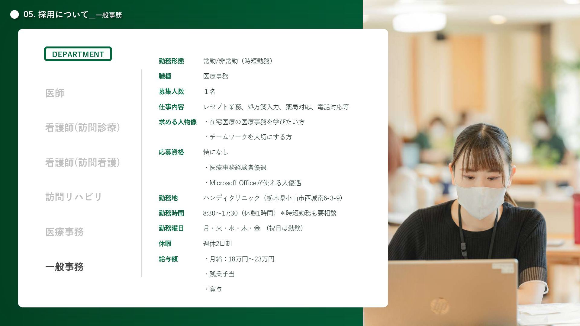 医療事務 募集⼈数 1名 仕事内容 レセプト業務、処⽅箋⼊⼒、薬局対応、電話対応等 求める⼈物像 ・在宅医療の医療事務を学びたい⽅ ・チームワークを⼤切にする⽅ 応募資格 特になし ・医療事務経験者優遇 ・Microsoft Officeが使える⼈優遇 勤務地 ハンディクリニック(栃⽊県⼩⼭市⻄城南6-3-9) 勤務時間 8:30〜17:30(休憩1時間)*時短勤務も要相談 勤務曜⽇ ⽉・⽕・⽔・⽊・⾦ (祝⽇は勤務) 休暇 週休2⽇制 給与額 ・⽉給:18万円〜23万円 ・残業⼿当 ・賞与 05. 採⽤について_⼀般事務