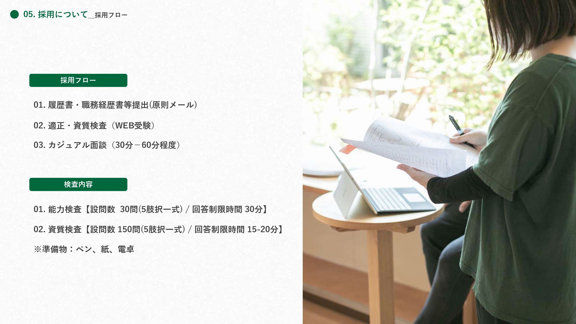 31. 採⽤フロー 05. 採⽤について_採⽤フロー 01. 履歴書・職務経歴書等提出(原則メール) 02. 適正・資質検査(WEB受験) 03. カジュアル⾯談(30分−60分程度) 検査内容