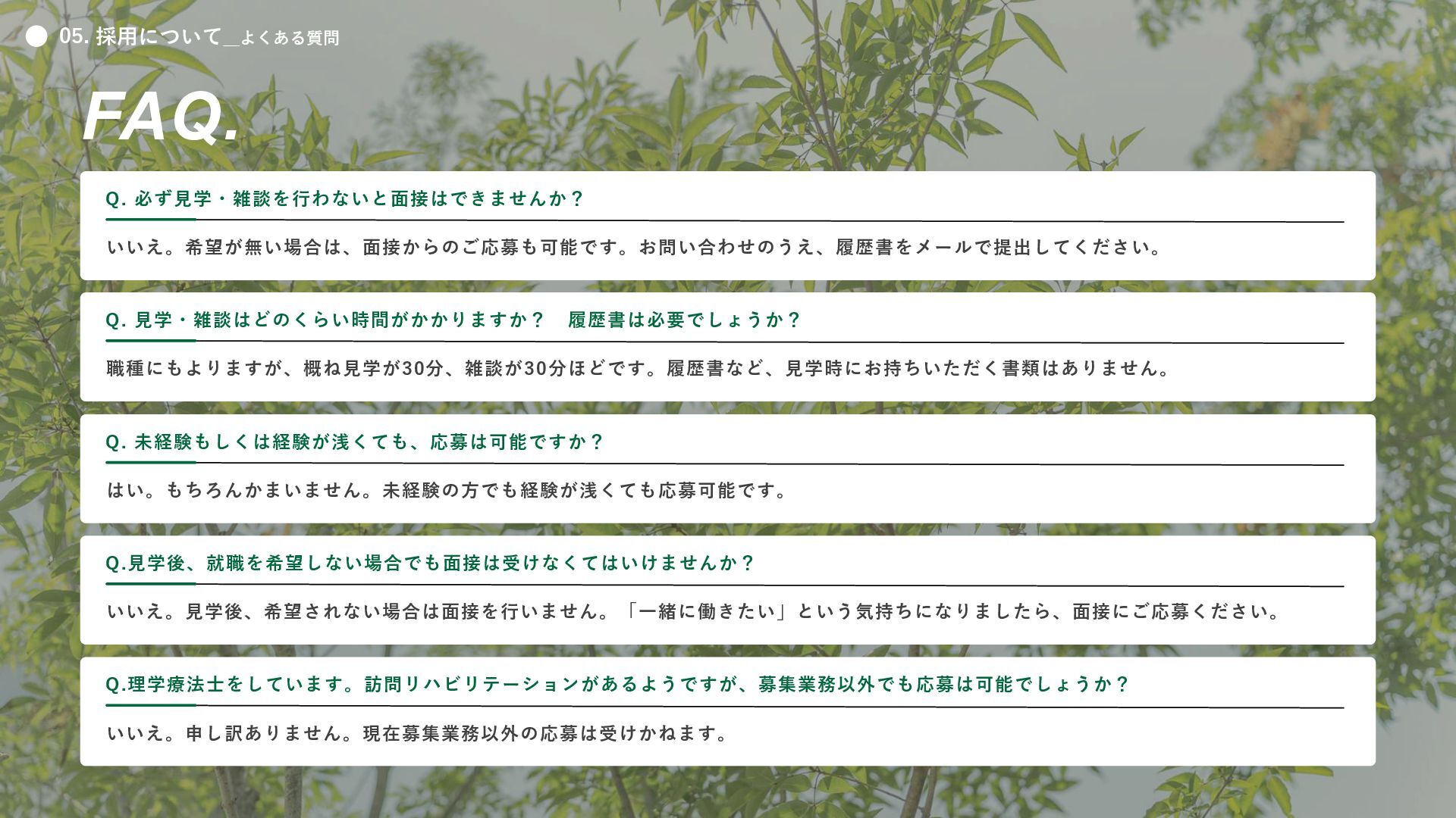 Q. 未経験もしくは経験が浅くても、応募は可能ですか? はい。もちろんかまいません。未経験の⽅でも経験が浅くても応募可能です。 Q.⾒学後、就職を希望しない場合でも⾯接は受けなくてはいけませんか? いいえ。⾒学後、希望されない場合は⾯接を⾏いません。「⼀緒に働きたい」という気持ちになりましたら、⾯接にご応募ください。 Q.理学療法⼠をしています。訪問リハビリテーションがあるようですが、募集業務以外でも応募は可能でしょうか? いいえ。申し訳ありません。現在募集業務以外の応募は受けかねます。