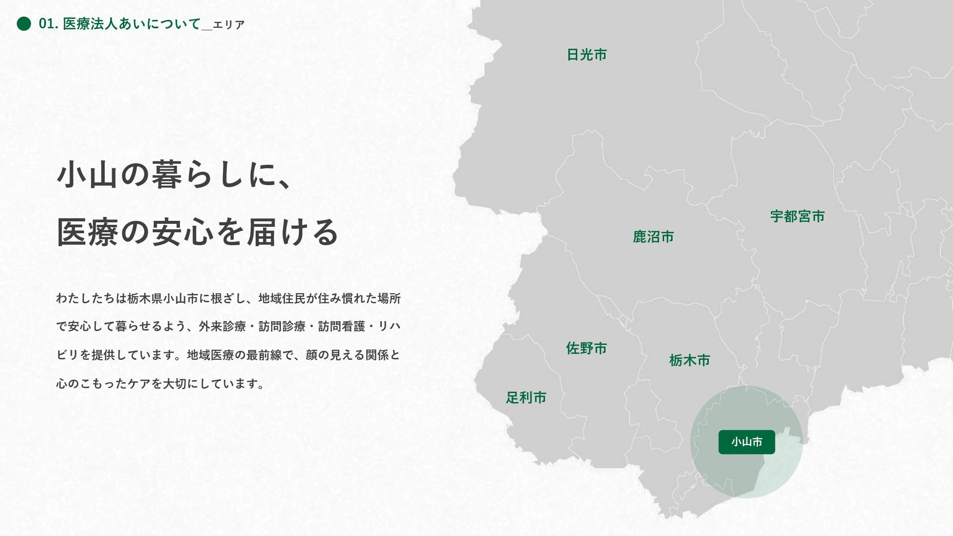 2. 名称 医療法⼈あい 開設 2001年(平成13年)5⽉1⽇ 所在地 〒323-0820 栃⽊県⼩⼭市⻄城南6-3-9 従業員数 45名 名称:訪問リハビリテーション