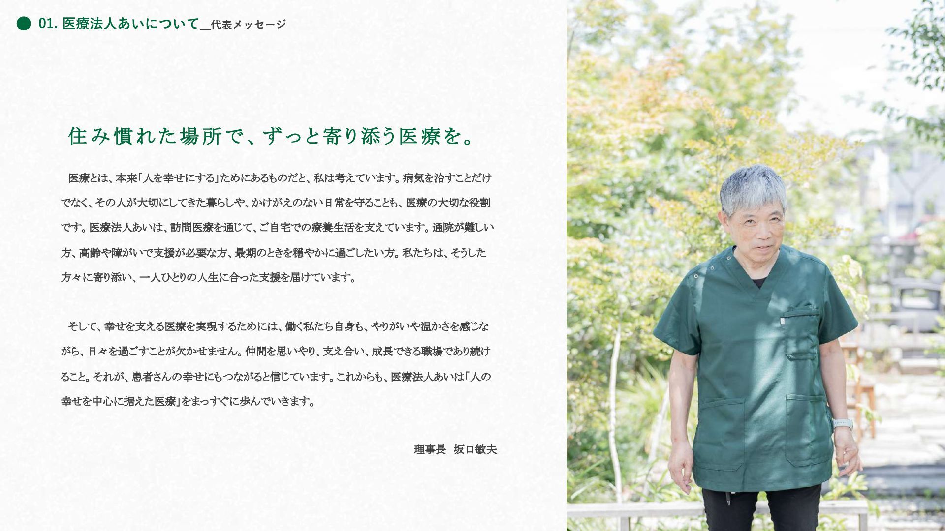 っ と 寄 り 添 う 医 療 を 。 医療とは、本来「人を幸せにする」ためにあるものだと、私は考えています。病気を治すことだけ でなく、その人が大切にしてきた暮らしや、かけがえのない日常を守ることも、医療の大切な役割 です。医療法人あいは、訪問医療を通じて、ご自宅での療養生活を支えています。通院が難しい 方、高齢や障がいで支援が必要な方、最期のときを穏やかに過ごしたい方。私たちは、そうした 方々に寄り添い、一人ひとりの人生に合った支援を届けています。 そして、幸せを支える医療を実現するためには、働く私たち自身も、やりがいや温かさを感じな がら、日々を過ごすことが欠かせません。仲間を思いやり、支え合い、成長できる職場であり続け ること。それが、患者さんの幸せにもつながると信じています。これからも、医療法人あいは「人の 幸せを中心に据えた医療」をまっすぐに歩んでいきます。 理事長 坂口敏夫 01. 医療法⼈あいについて_代表メッセージ