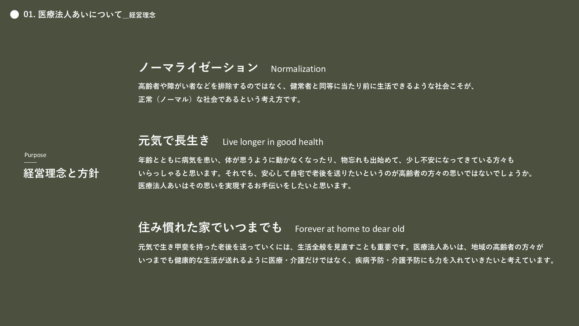 in good health 住み慣れた家でいつまでも Forever at home to dear old 元気で⽣き甲斐を持った⽼後を送っていくには、⽣活全般を⾒直すことも重要です。医療法⼈あいは、地域の⾼齢者の⽅々が いつまでも健康的な⽣活が送れるように医療・介護だけではなく、疾病予防・介護予防にも⼒を⼊れていきたいと考えています。 経営理念と⽅針 Purpose 01. 医療法⼈あいについて_経営理念