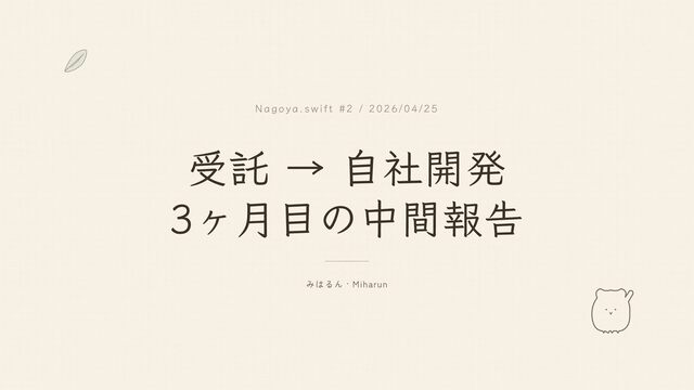 Nagoya.swift #2 / 2026/04/25 受託 → 自社開発 3ヶ月目の中間報告 みはるん ·