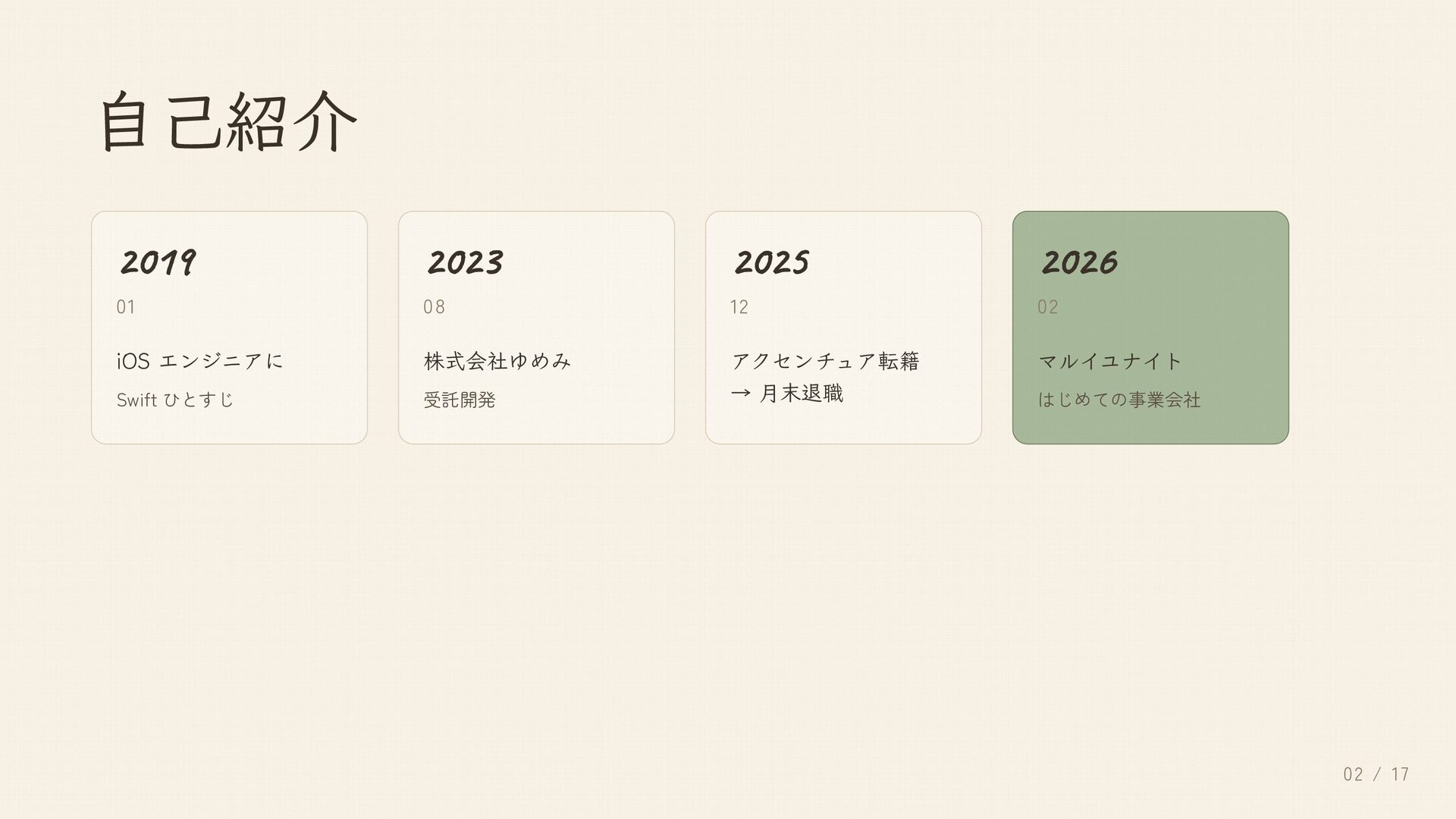 受託開発 2025 12 アクセンチュア転籍 → 月末退職 2026 02 マルイユナイト はじめての事業会社 02 / 17