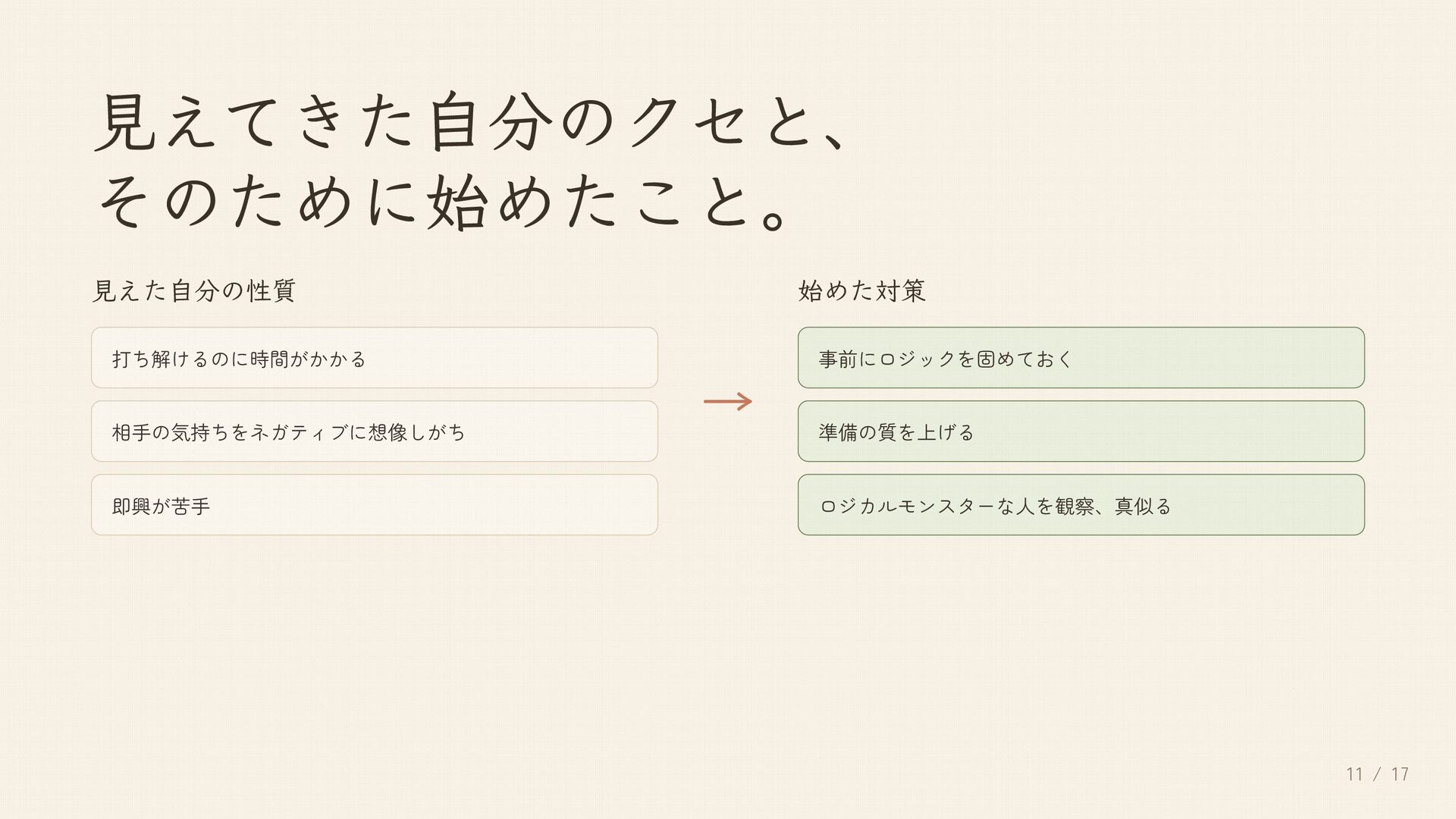 見えてきた自分のクセと、 そのために始めたこと。 見えた自分の性質 打ち解けるのに時間がかかる 相手の気持ちをネガティブに想像しがち 即興が苦手 → 始めた対策 事前にロジックを固めておく 準備の質を上げる