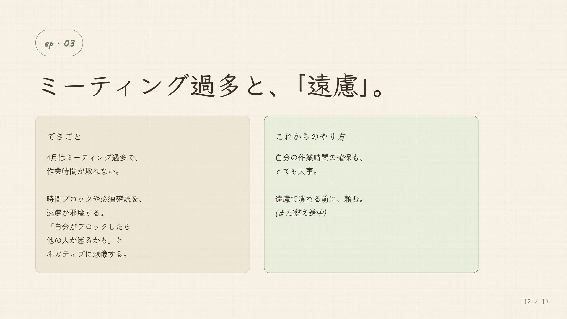 ep · 03 ミーティング過多と、 「遠慮」 。 できごと 4月はミーティング過多で、 作業時間が取れない。 時間ブロックや必須確認を、
