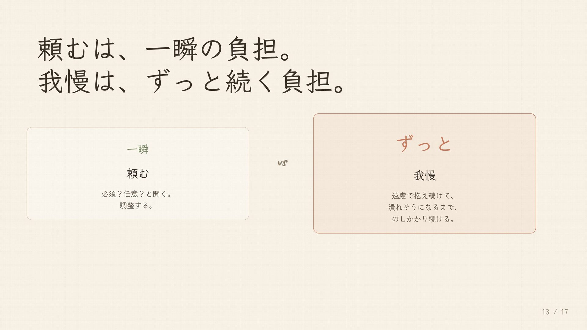 頼むは、一瞬の負担。 我慢は、ずっと続く負担。 一瞬 頼む 必須?任意?と聞く。 調整する。 vs ずっと 我慢 遠慮で抱え続けて、
