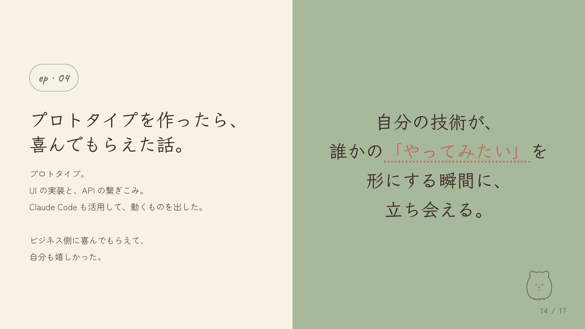 Code も活用して、動くものを出した。 ビジネス側に喜んでもらえて、 自分も嬉しかった。 自分の技術が、 誰かの「やってみたい」を 形にする瞬間に、 立ち会える。 14 / 17