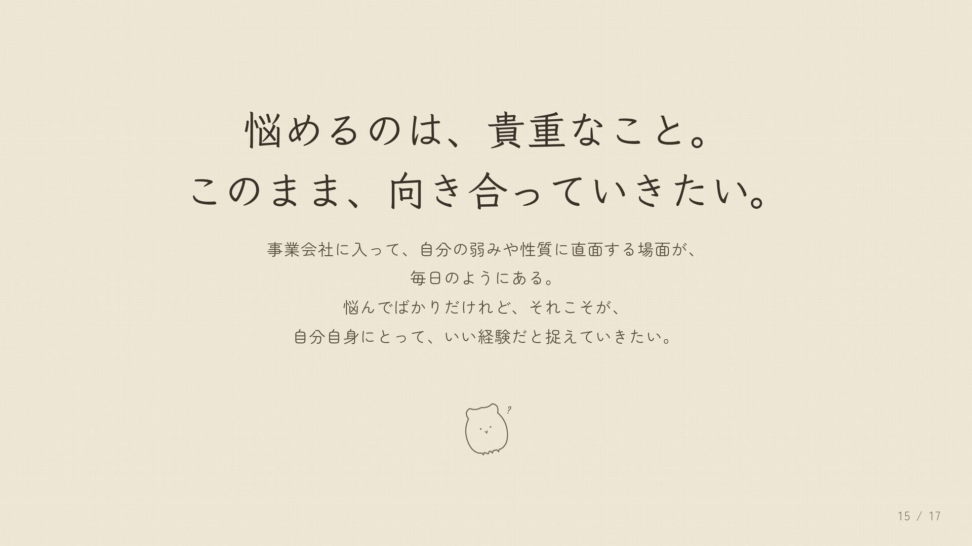 悩めるのは、貴重なこと。 このまま、向き合っていきたい。 事業会社に入って、自分の弱みや性質に直面する場面が、 毎日のようにある。 悩んでばかりだけれど、それこそが、 自分自身にとって、いい経験だと捉えていきたい。 ? 15 / 17