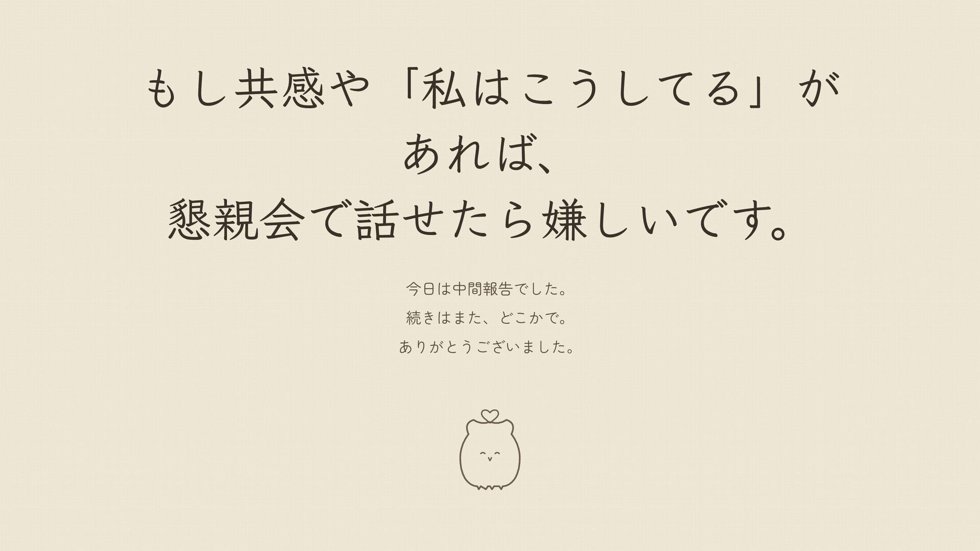 もし共感や「私はこうしてる」が あれば、 懇親会で話せたら嫌しいです。 今日は中間報告でした。 続きはまた、どこかで。 ありがとうございました。